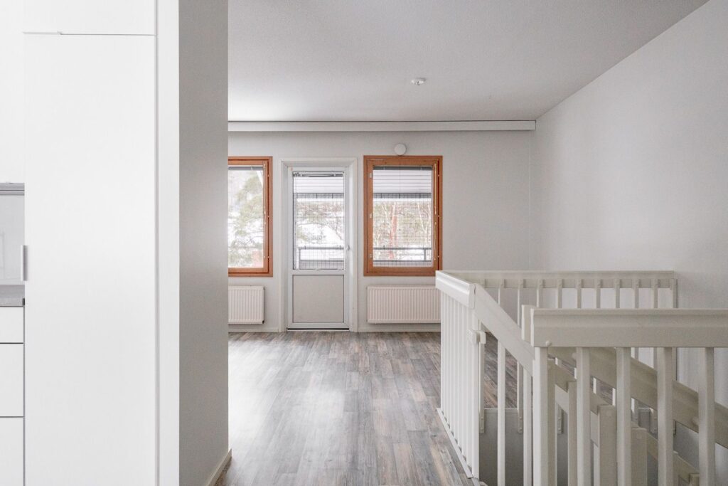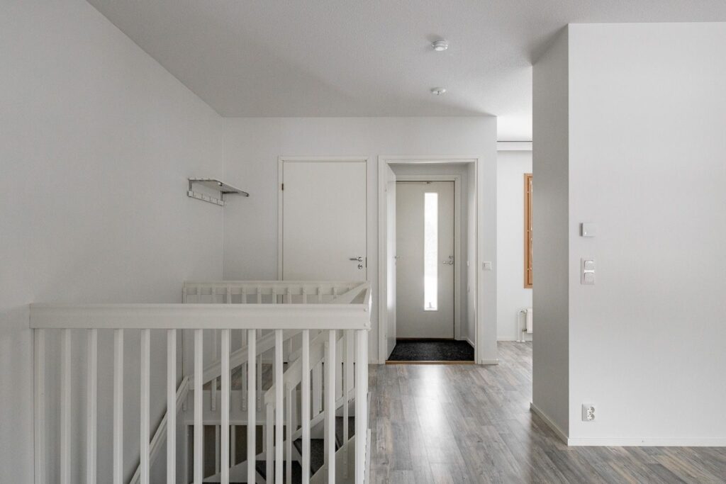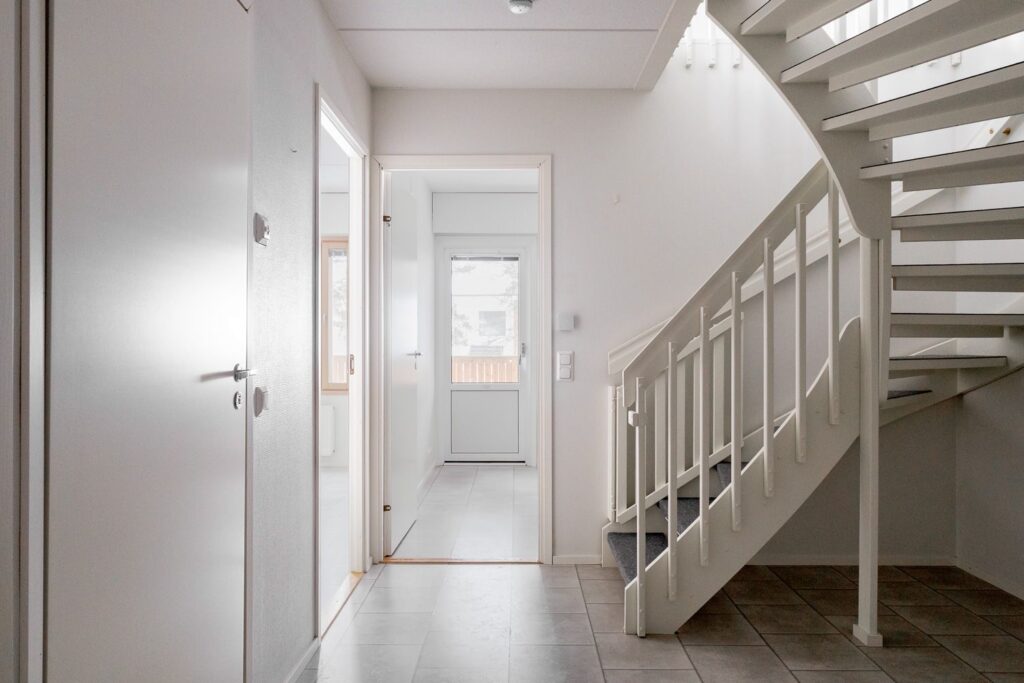 Oma ulkoiluvälinevarasto sijaitsee jokaisen huoneiston sisäänkäynnin vieressä.