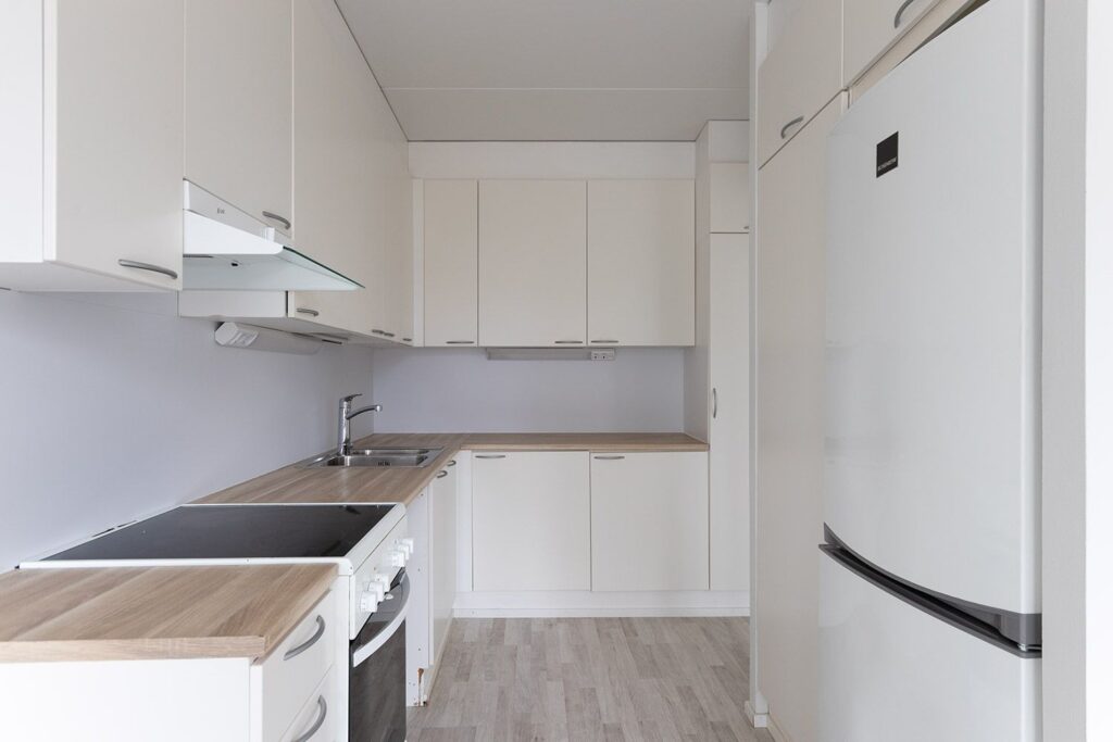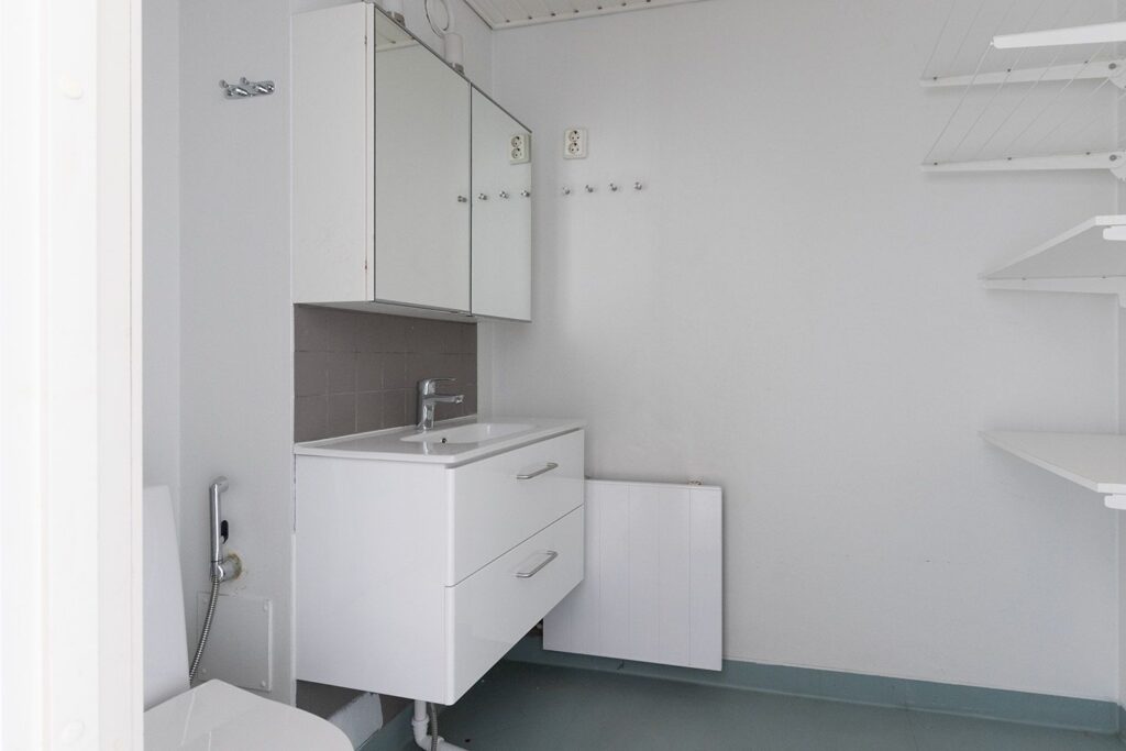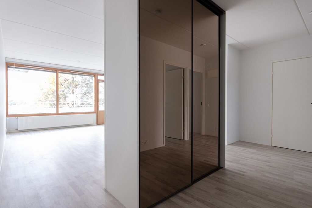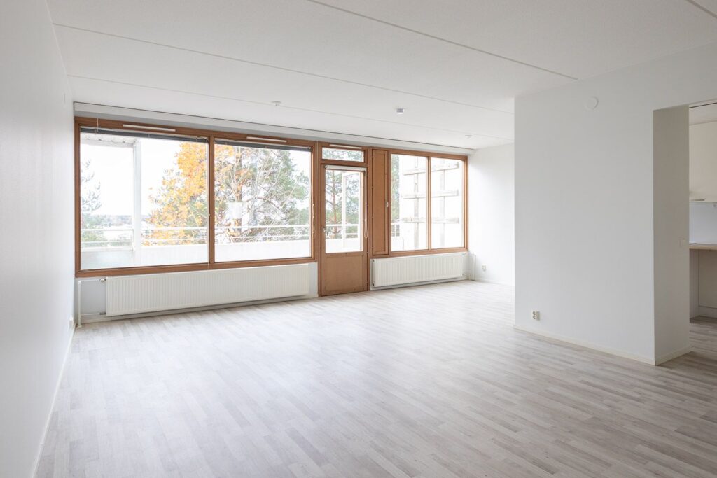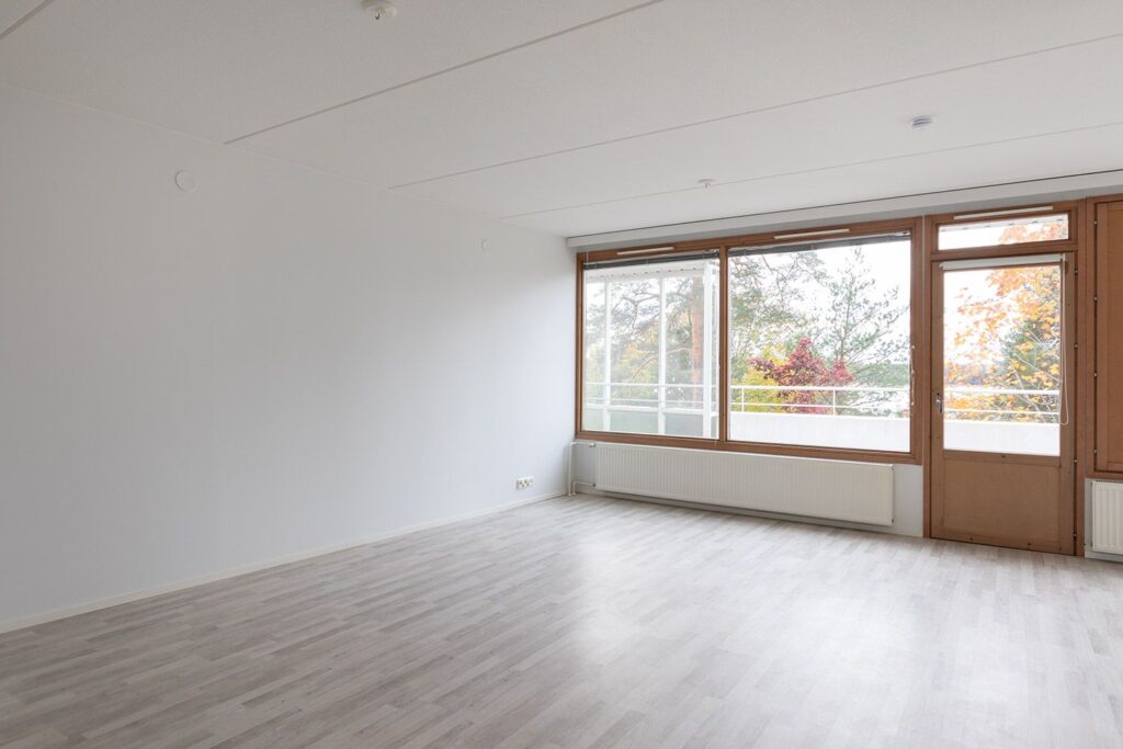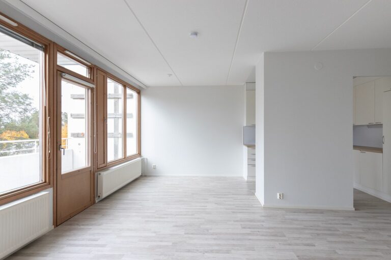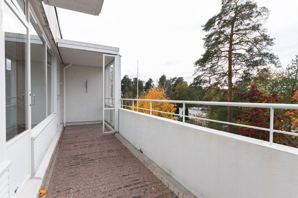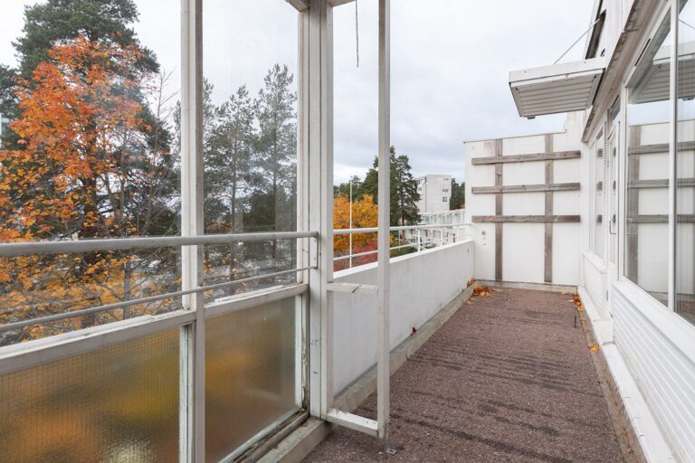 Valoisa läpitalon neliö suurella länsiparvekkeella ja rauhallisilla näkymillä. Hiljattain remontoidun keittiön ruokailutila on reilun kokoinen. Parvekkeella saa grillata sähkö- ja kaasugrillillä. Autolle on paikka autokatoksessa. Tämä on päättyvän tien viimeinen talo ja talon takaa menee rantaraitin ulkoilupolut.