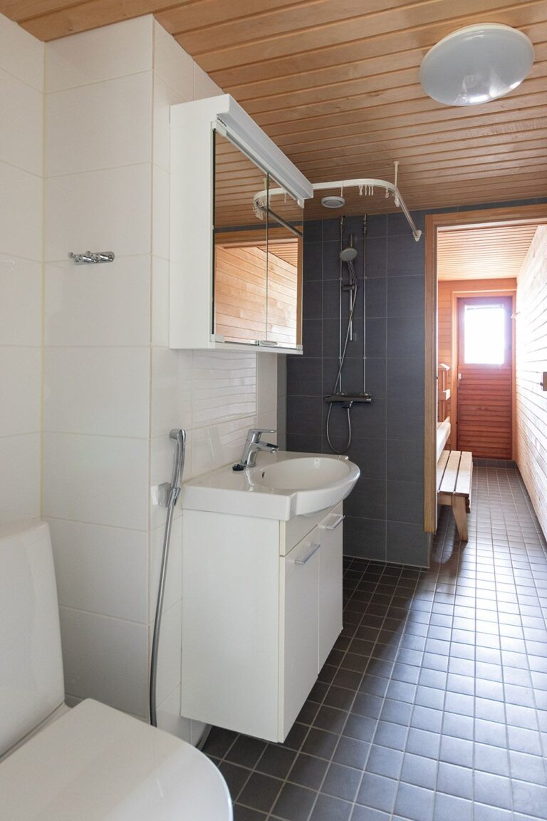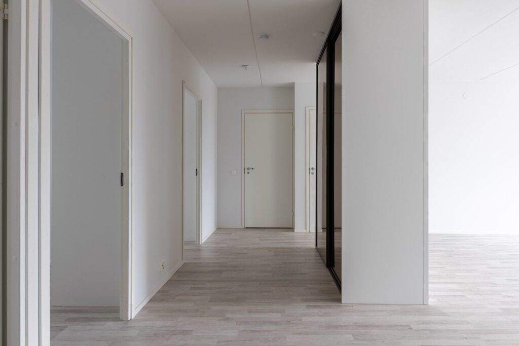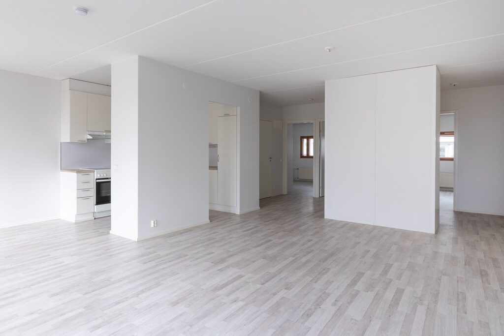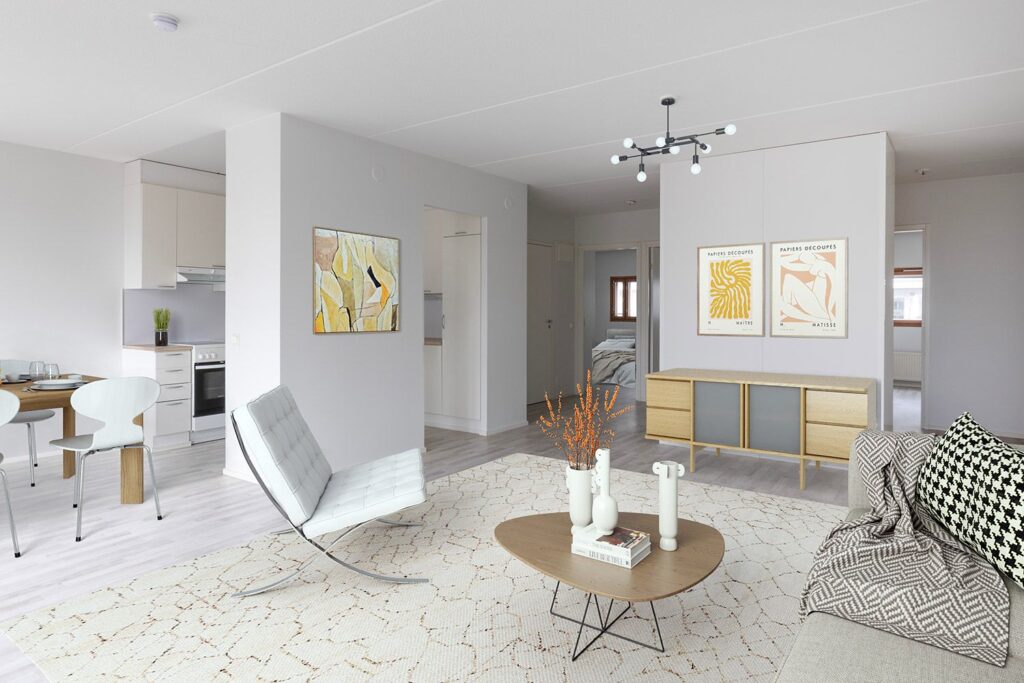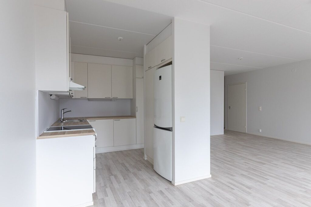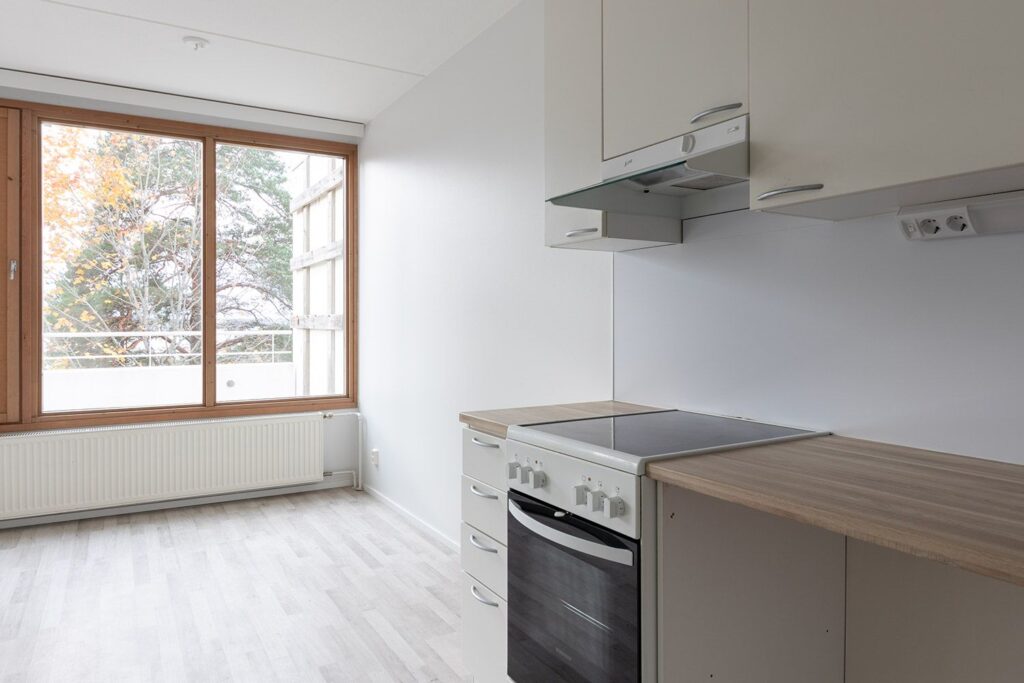 Valoisa läpitalon neliö suurella länsiparvekkeella ja rauhallisilla näkymillä. Hiljattain remontoidun keittiön ruokailutila on reilun kokoinen. Parvekkeella saa grillata sähkö- ja kaasugrillillä. Autolle on paikka autokatoksessa. Tämä on päättyvän tien viimeinen talo ja talon takaa menee rantaraitin ulkoilupolut.