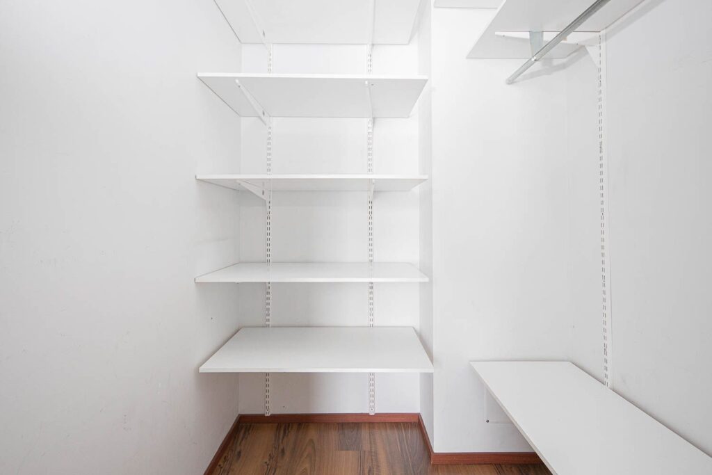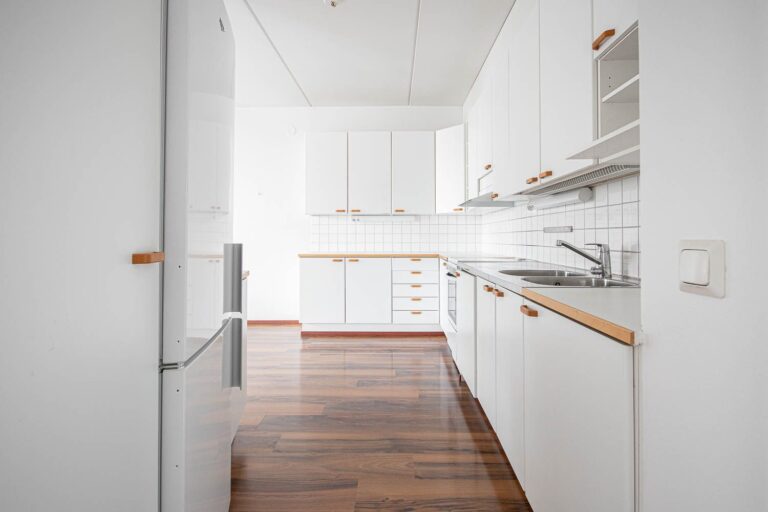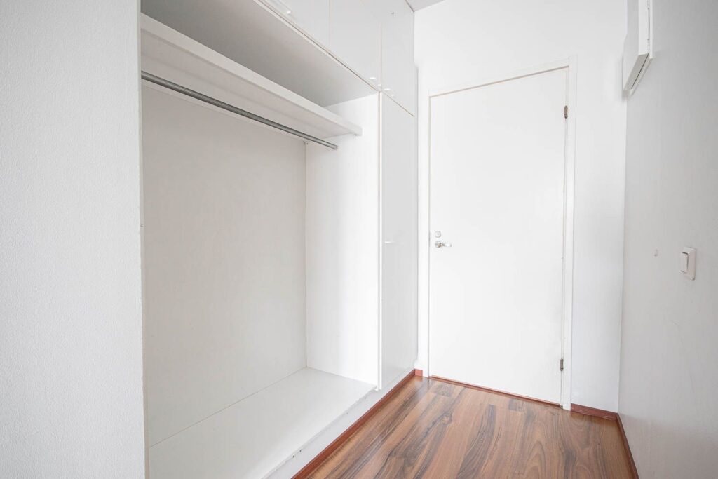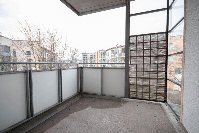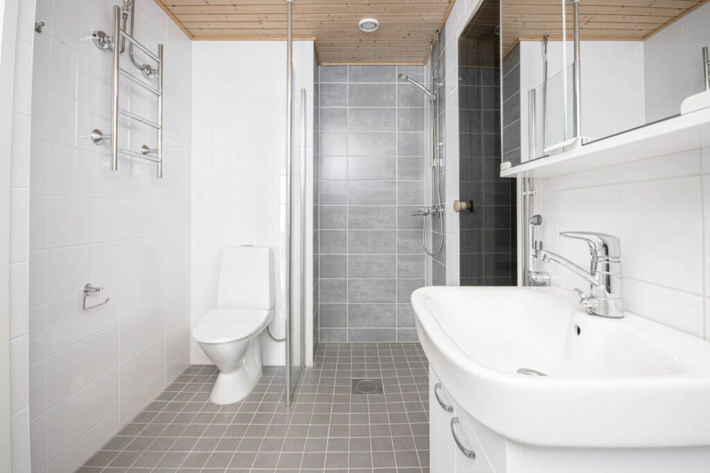 Kolmannen kerroksen viihtyisä ja tilava kaksio, jossa oma sauna ja erillinen vaatehuone. Kylpyhuoneessa on ajattoman tyylikästä harmaata ja valkoista laattaa.