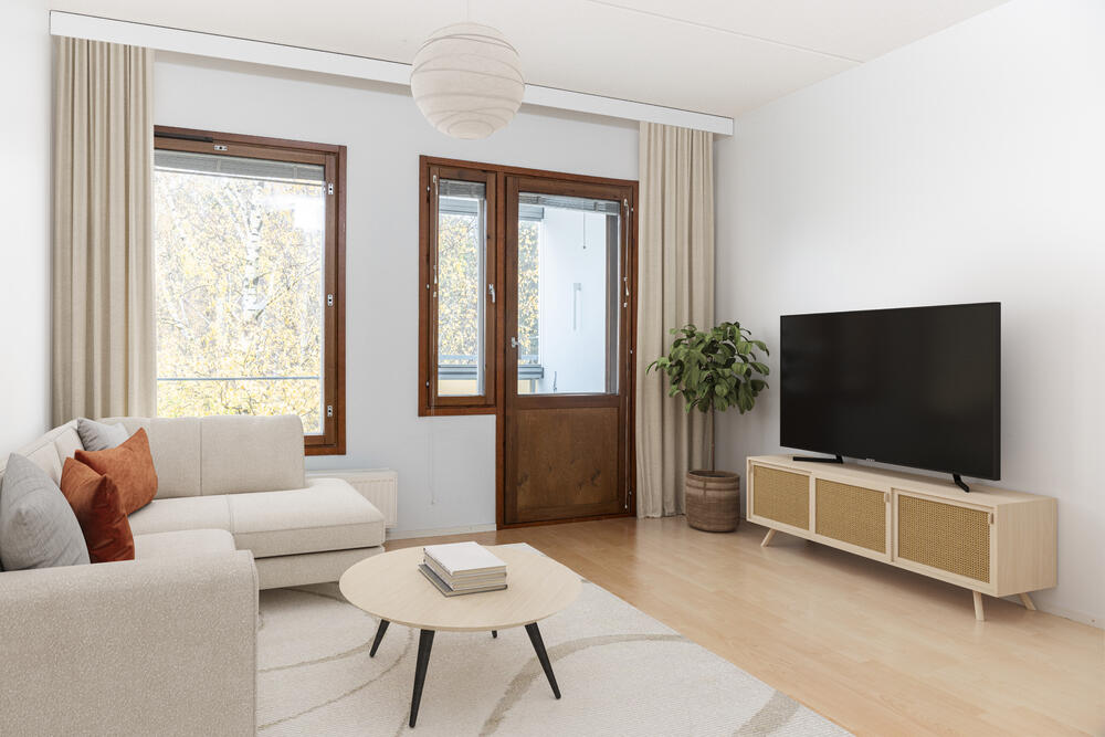Kolmannen kerroksen saunallinen kolmio hissitalossa. Läpitalon asunto, jossa on ikkunoita kahteen ilmansuuntaan. Keittiö ja olohuone ovat omat erilliset tilansa, ja olohuoneesta pääsee asunnon parvekkeelle. Asumismukavuutta lisää erillis-wc kylpyhuoneen lisäksi.