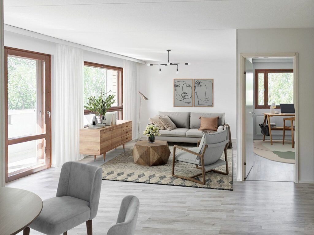 Valoisa ylimmän kerroksen asunto, jossa eteisestä avautuu näkymä olohuoneeseen. Ikkunoista avautuu valoisa ja vihreä näkymä, jossa vastassa ei ole toinen kerrostalo. Avara remontoitu keittiö ja olohuone tuovat koko perheen ystävineen yhteiseen tilaan. Asumismukavuutta lisäävät kaksi wc:tä sekä ikkunallinen oma sauna. Kylpyhuone, sauna ja erillinen WC on vasta remonteitu.