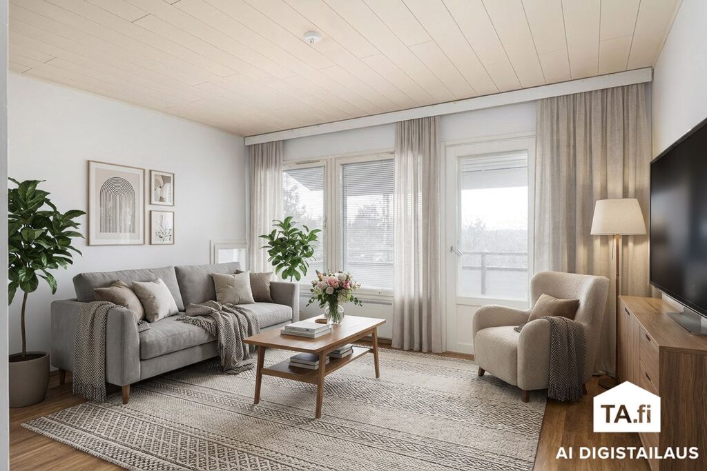 Avara olohuone tarjoaa runsaasti tilaa yhdessäololle ja rentoutumiselle, ja se muuntautuu helposti niin arjen askareisiin kuin juhlahetkiinkin. Luonnonvalo tulvii sisään ja luo tilaan miellyttävän tunnelman. Olohuoneen yhteydessä oleva käytännöllinen ja hyvin varusteltu keittiö tekee ruoanlaitosta sujuvaa, ja selkeä pohjaratkaisu mahdollistaa luontevan seurustelun perheen ja vieraiden kanssa.