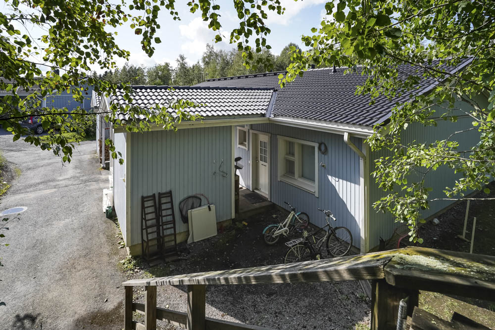 Vapautumassa yksikerroksinen tilava kolmio paritalosta rauhallisesta taloyhtiöstä. Ihastuttava koti perheelle palveluiden läheisyydestä. Keittiö ja olohuone ovat yhtä avaraa tilaa. Oma takapiha suuntaa länteen. Tässä asunnossa nautit oman saunan löylyistä silloin kun sinulle sopii. Kylmä varastotila sijaitsee asunnon edessä. Kohteen asuntojen kylpyhuoneet on remontoitu vuosina 2011-2012. Asunnolle kuuluu yksi autopaikka, joka sijaitsee asunnon edessä.