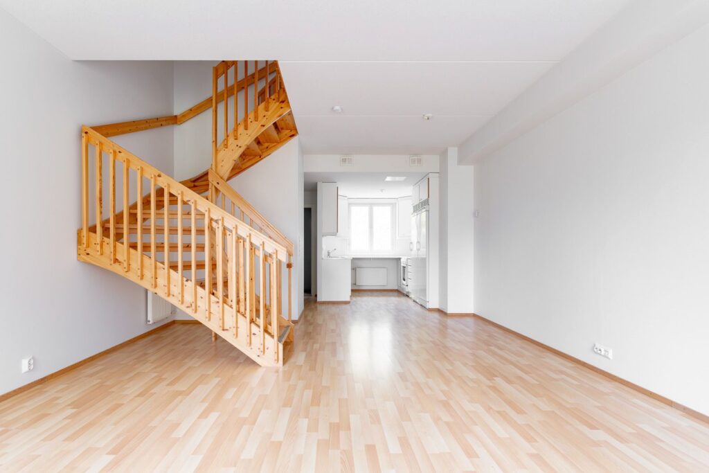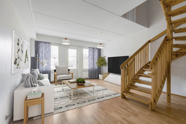 Tilava ja kodikas kaksitasoinen kolmio. Arjen toimivuutta asunnossa lisäävät kaksi vaatehuonetta ja wc:tä. Makuuhuoneet ovat omassa rauhassaan yläkerrassa ja keittiö sekä olohuone alakerrassa.