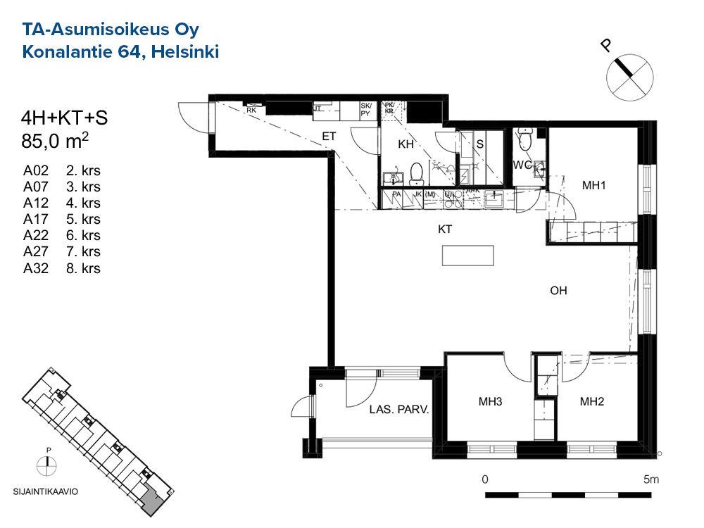 A 2 4h+kt+s 85,0 m² 2/8 Kerrostalo