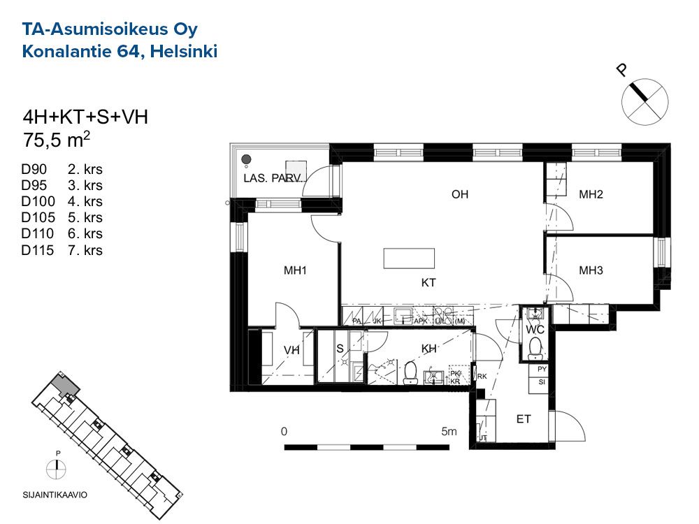 D 105 4h+kt+s 75,5 m² 5/8 Kerrostalo