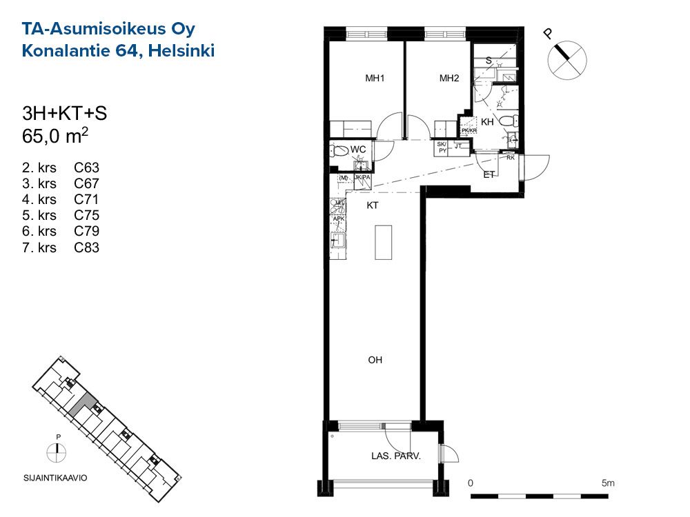 C 72 3h+kt 65,0 m² 5/8 Kerrostalo