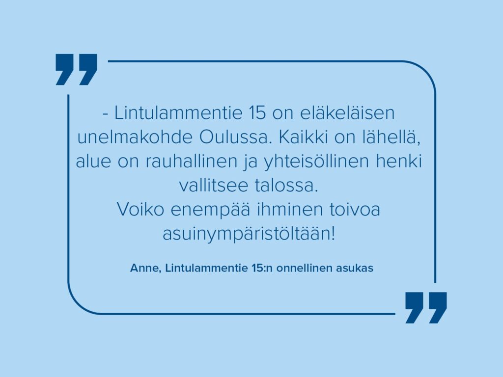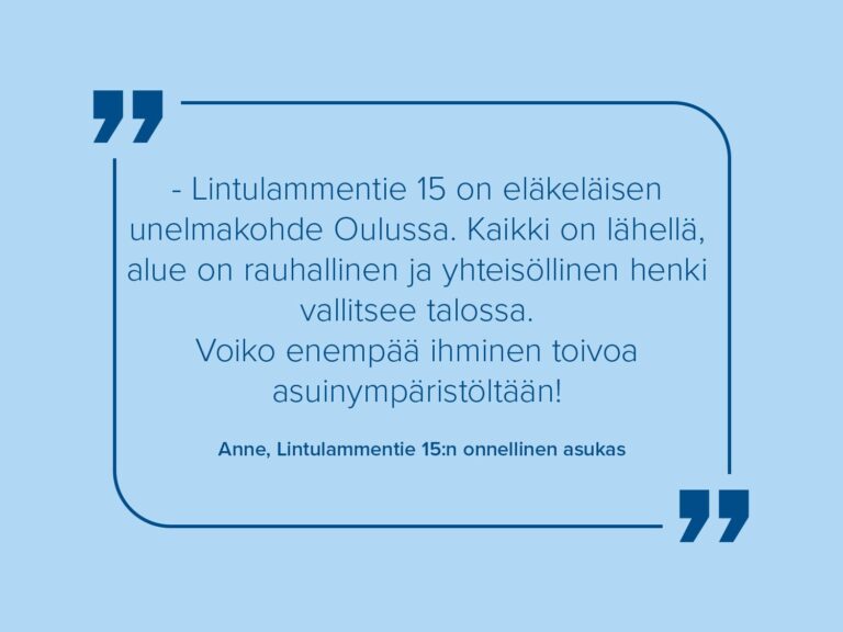Lintulammentie 15 B on Höyhtyällä sijaitseva senioreille suunnattu vuokrakohde. Suosittu Karjasillan asuinalue sijaitsee vain parin kilometrin päässä keskustan palveluista. Kaikki arjen palvelut ja harrastusmahdollisuudet löytyvät lyhyen kävely- tai pyöräilymatkan päästä, ja omalla autolla pääsee nopeasti eri puolille Oulua. Lähin ruokakauppa on aivan Lintulammentie 15:n naapurissa.