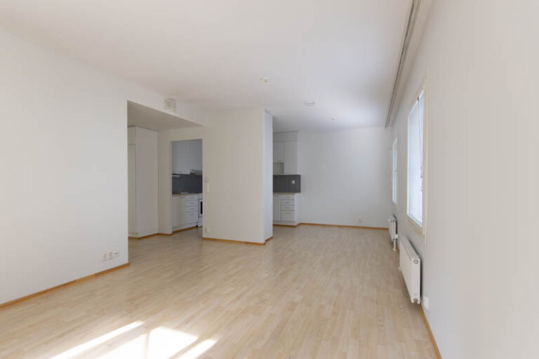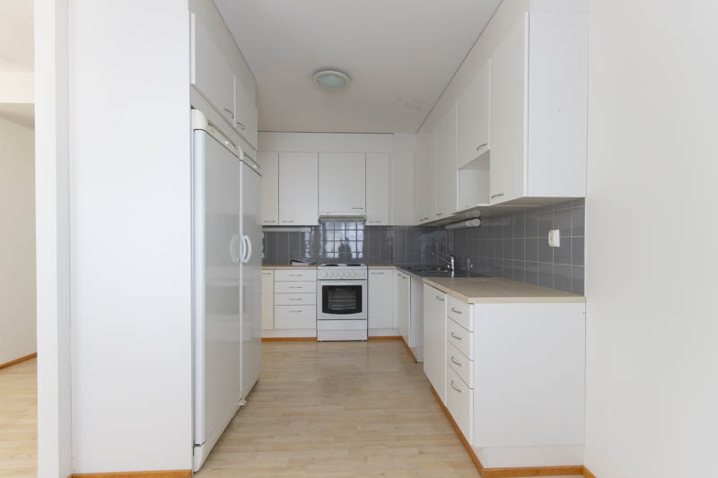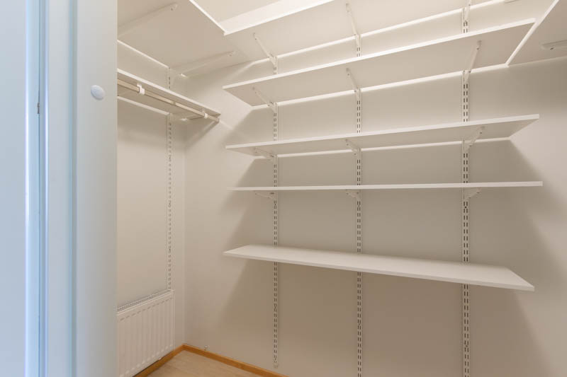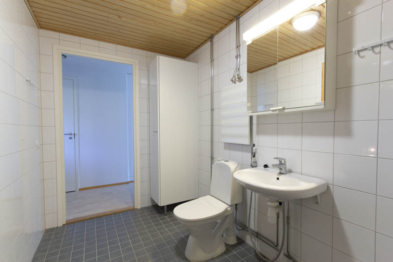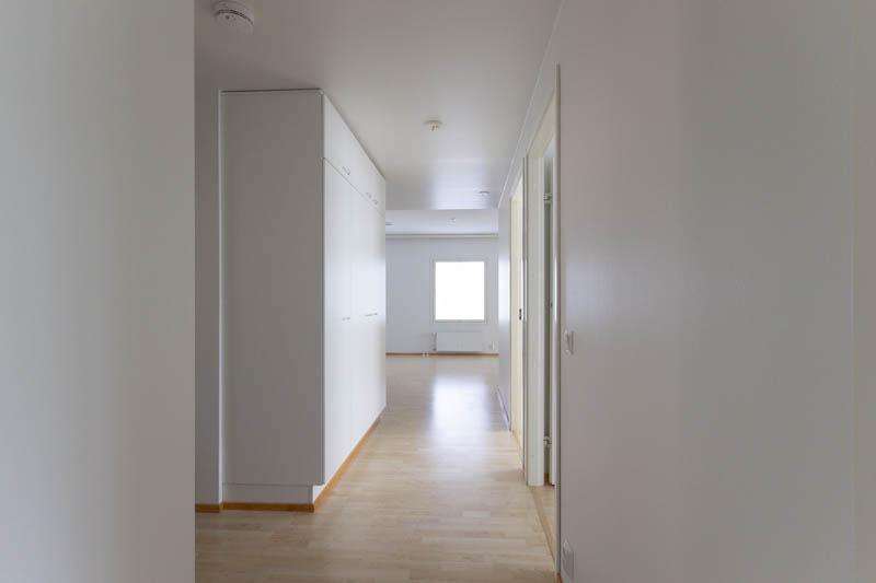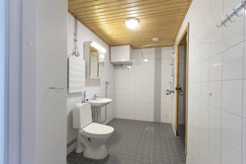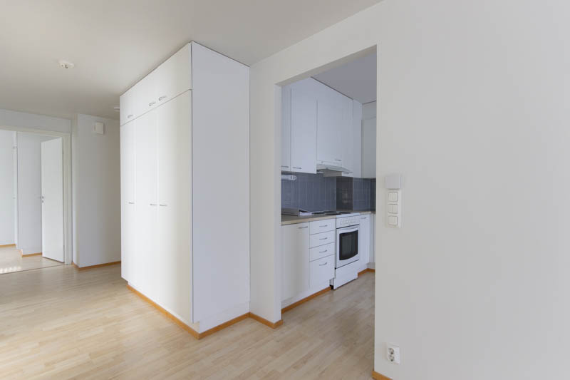 The kitchen and living room form a spacious whole. The living room has access to the balcony. This three-bedroom apartment has a windowed sauna, two toilets and a walk-in closet. Additional storage space can be found in the closets in the bedrooms and hallway. The apartment includes a separate storage room. Residents have free access to a laundry room.