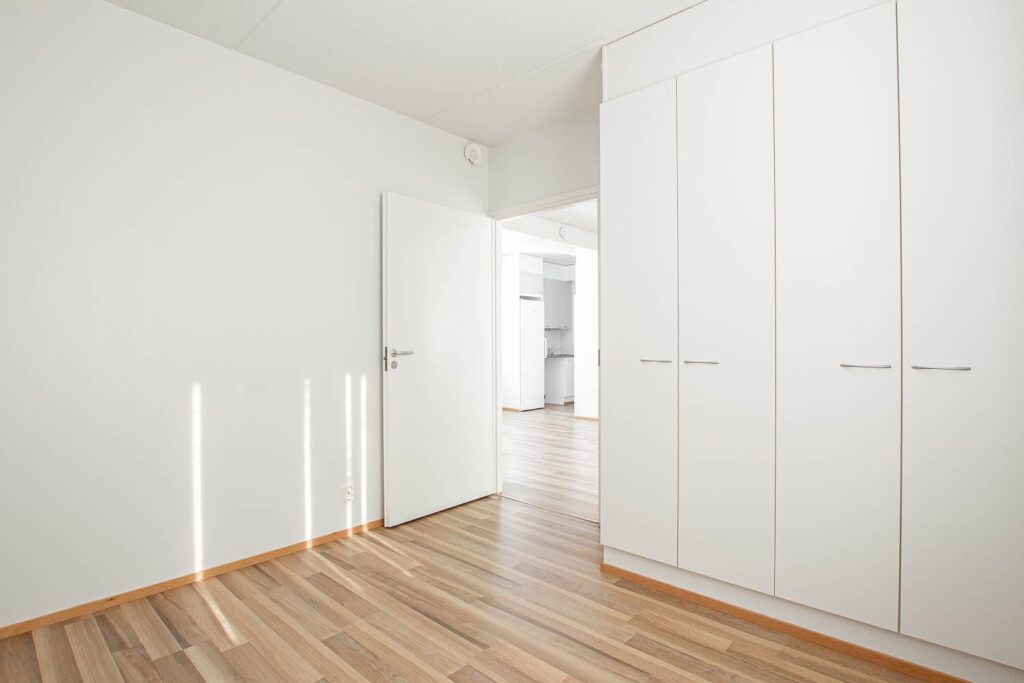 The apartment is entered through a spacious separate hallway, where ample storage space makes everyday life smooth. More storage space can be found in the bedroom cabinets and a separate walk-in closet.