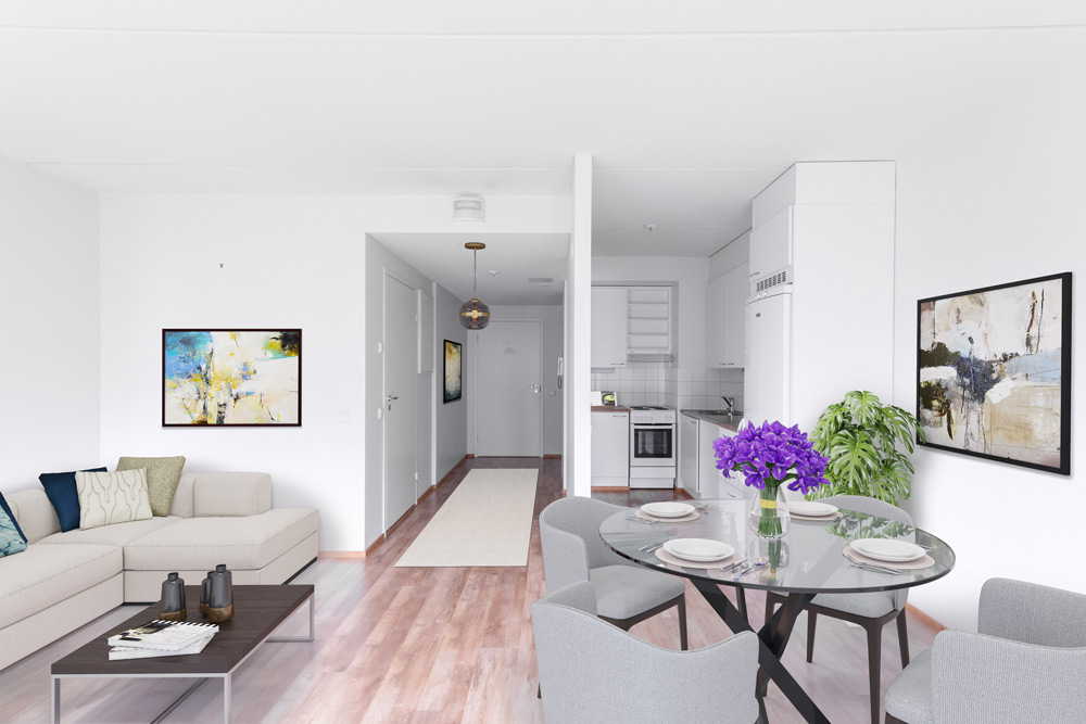 The apartments have laminate floors, tiled bathrooms, a sauna and some have a balcony. The building has heated storage rooms for individual apartments, a shared outdoor equipment storage room, and a children’s play area in the yard.