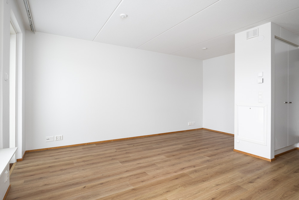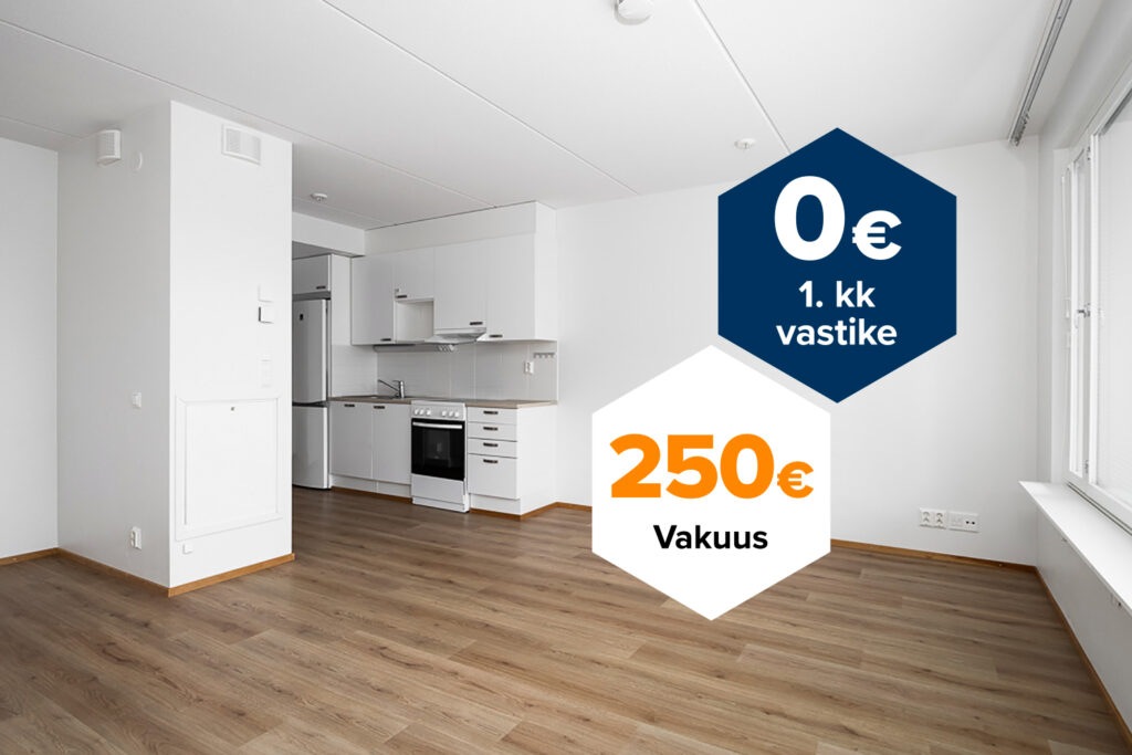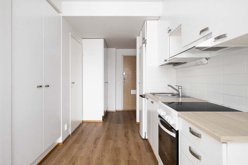 Available studio apartment with alcove on the third floor! This cozy apartment has a spacious floor plan – the kitchen is a single space with the living room. There is plenty of cupboard space in the hallway and bathroom. A large balcony adds to the living comfort. The floors of the apartment are laminate, and the bathroom has tiled walls and floors. Venetian blinds on the windows increase the living comfort. The kitchen has a ceramic hob, fridge freezer and space for a dishwasher and microwave. The bathroom has plenty of storage space: a mirror cabinet, a sink cabinet and a laundry cabinet. There is also space for a washing machine and dryer. If you wish, you can book a sauna session in the house sauna on the attic floor, which also has a cooling terrace.