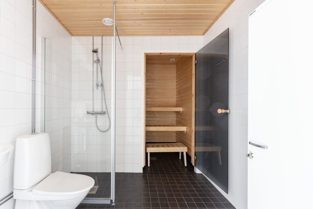There is a spacious walk-in closet connected to the bedroom, which offers plenty of storage space and makes everyday life easier. In addition, the apartment has its own sauna, where you can enjoy a steam bath whenever you want.