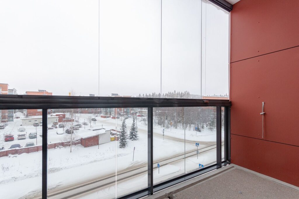 The living room has access to a glazed balcony, which offers views towards Kaijanlammentie. The balcony serves as a nice additional space well into autumn.