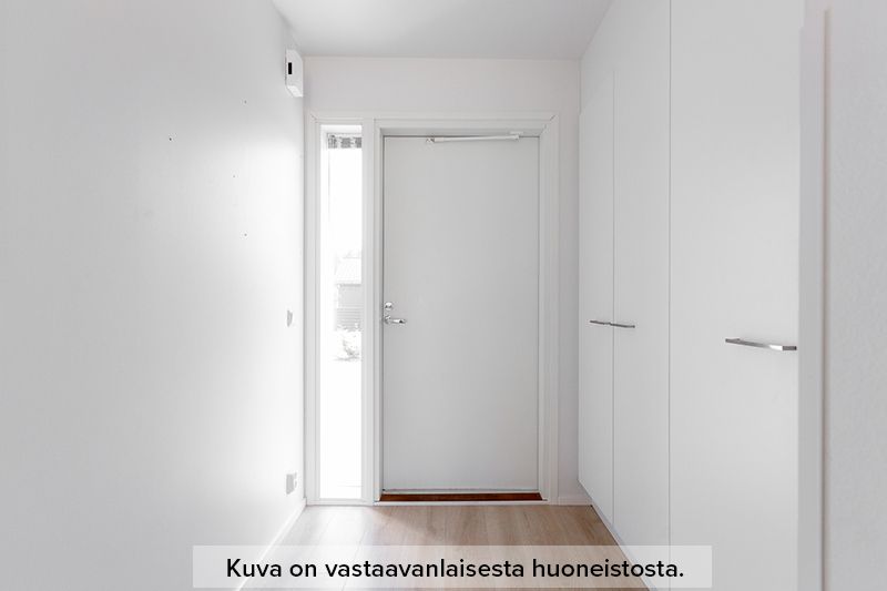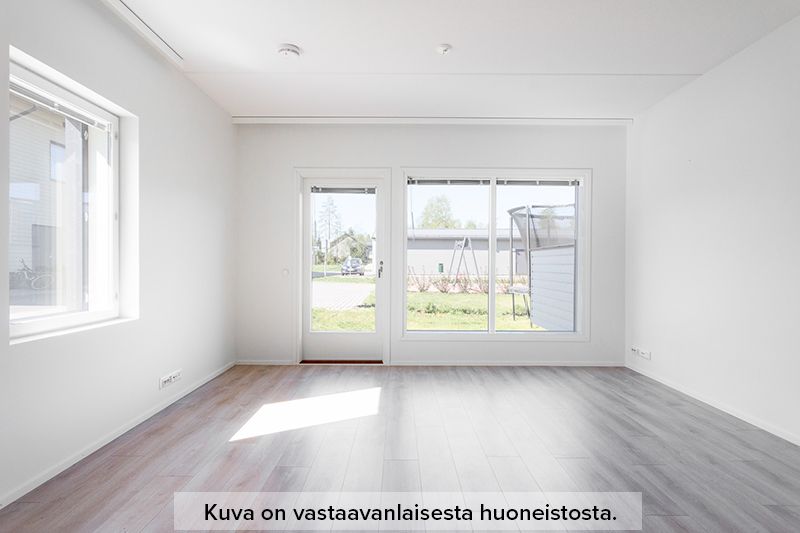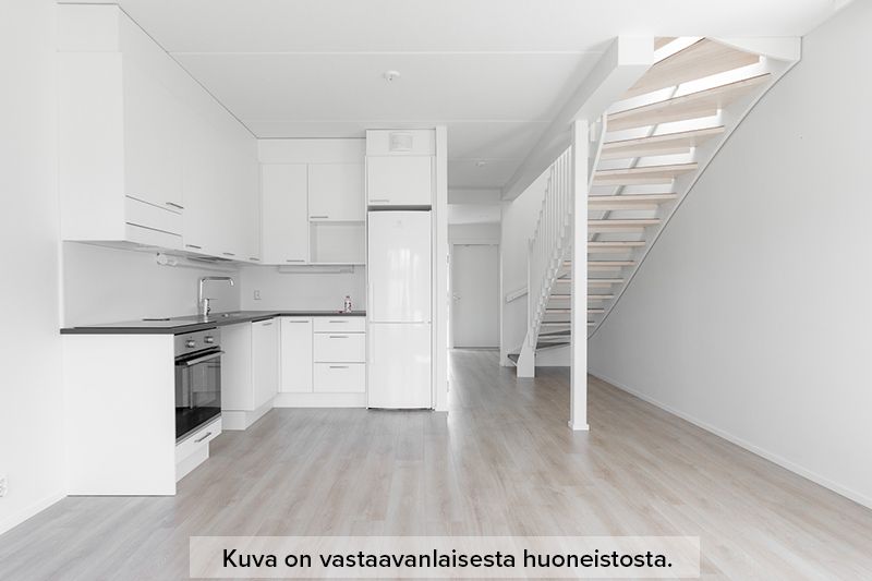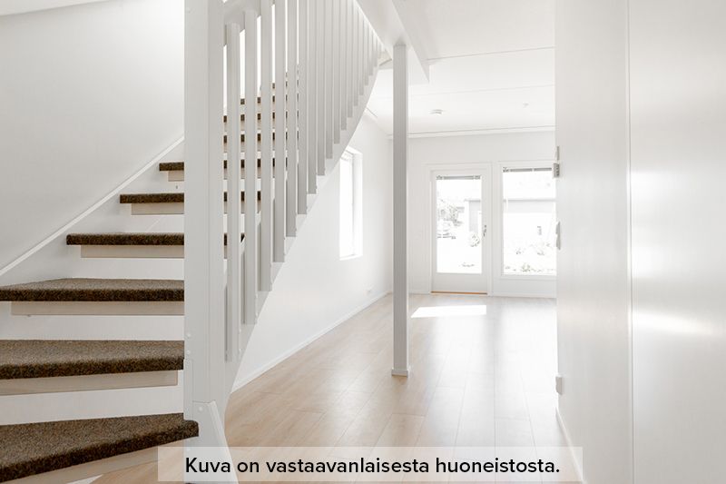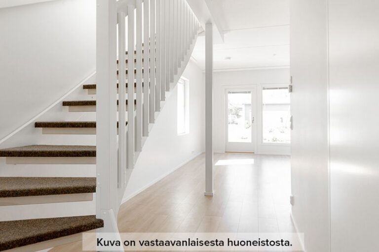 A bright two-story terraced house triangle in Yli-Maaria, Turku. The front door of the apartment leads to the hallway, where there is plenty of storage space. On the first floor there is a spacious living room, open kitchen and dining area, which form a cozy living space. The home’s large windows bring light and a sense of space. The ground floor of the property also has a bathroom and a private sauna. On the second floor, there are two quiet bedrooms, another bathroom and a practical walk-in closet. The photos are model photos of a similar 77.5m2 apartment, so the surface materials and equipment may vary.