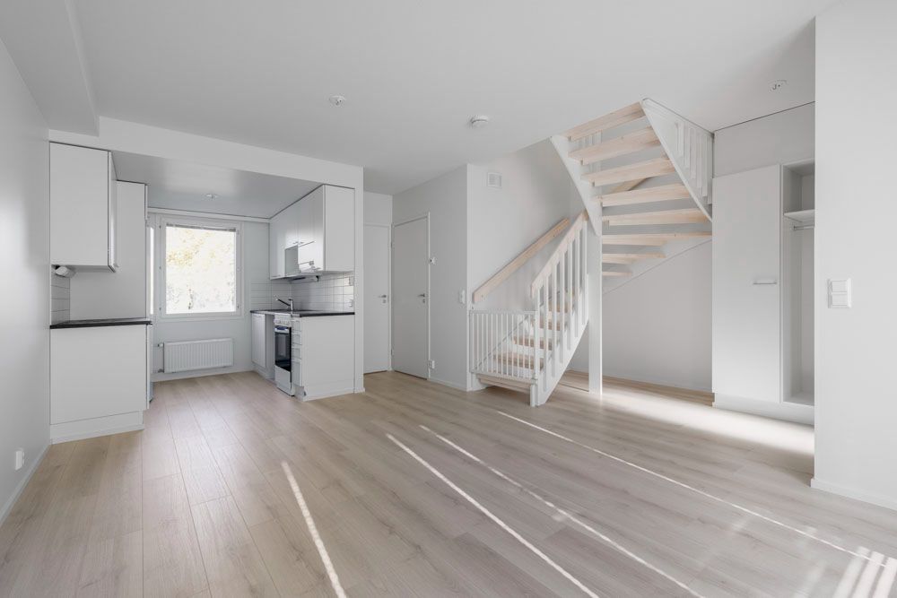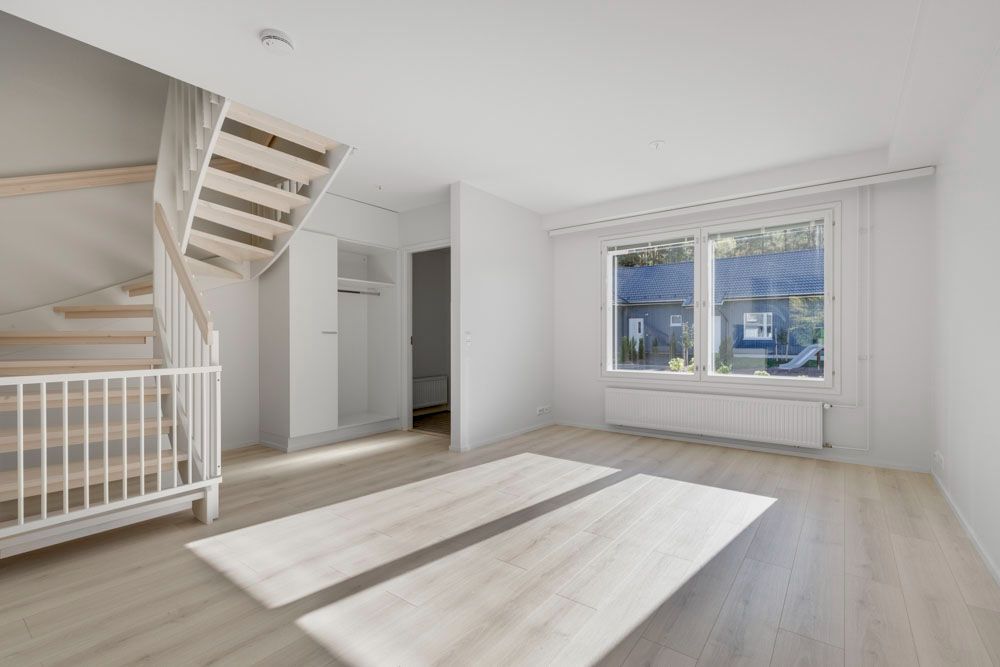 On the first floor of this two-level townhouse, the kitchen opens into a spacious living room, which overlooks a private terrace. The large downstairs wardrobe is a great place to keep your belongings organized, and there is even more storage space in the upstairs bedrooms. There is also a spacious bathroom and a private sauna upstairs. In the summer, you can grill or even read on the sunny private terrace. On the cool evenings of autumn and winter, it is nice to heat up your own sauna and take a breather.