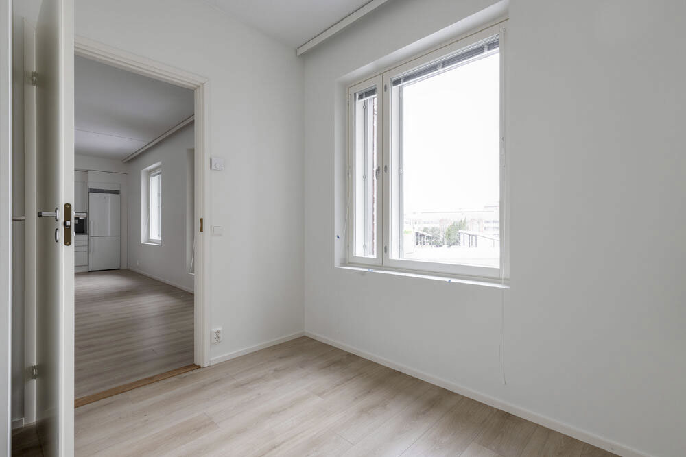 The second-floor apartment offers a clear and functional floor plan, where the square footage has been used efficiently. The hallway opens up to a view directly into the heart of the apartment, the spacious living room and kitchen. The kitchen is conveniently placed against the wall, leaving plenty of space for the dining area and living area. The apartment has two bedrooms, which are suitable for family needs as well as a work space or guest room. The living room continues onto a glazed west-facing balcony, where you can enjoy the evening sun and additional living space all year round. The whole is bright, clear-lined and easy to decorate, which makes this home cozy and functional.