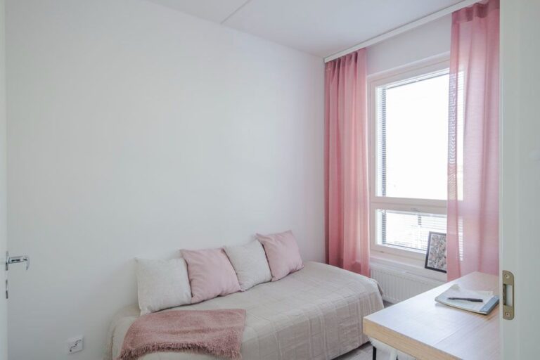 Fourth floor triangle with a functional floor plan. This home has a spacious kitchen area, which is slightly separate from the living room and can also easily accommodate a dining table. There are storage spaces in the form of both closets and a walk-in closet. There is no sauna in this home, but if you wish, you can book a sauna session in the house’s communal sauna. The pictures shown in the advertisement are of an apartment with a similar floor plan.