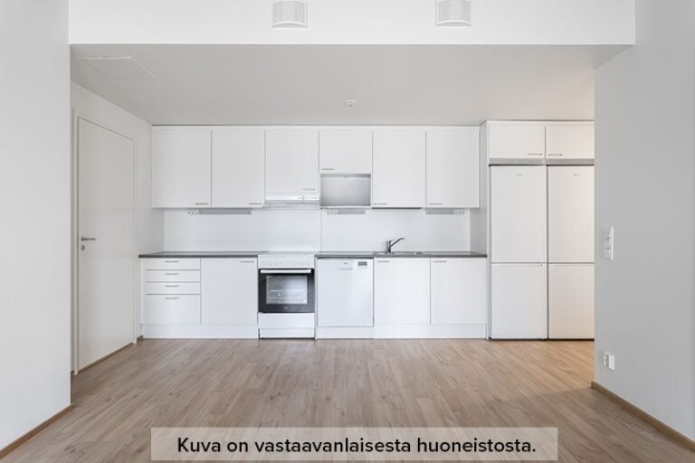 You enter the apartment through the hallway, which has storage space. The apartment’s functional open kitchen opens into the living room. The kitchen has two refrigerators, a white 60 cm wide dishwasher, a 60 cm wide space for a microwave oven and a ceramic floor stove.