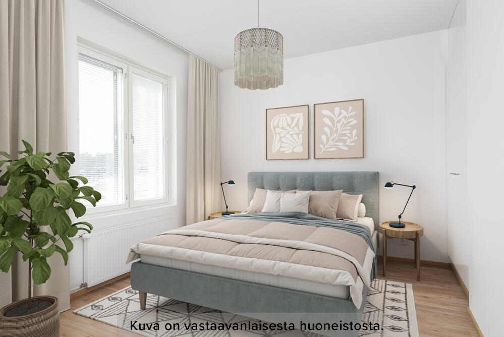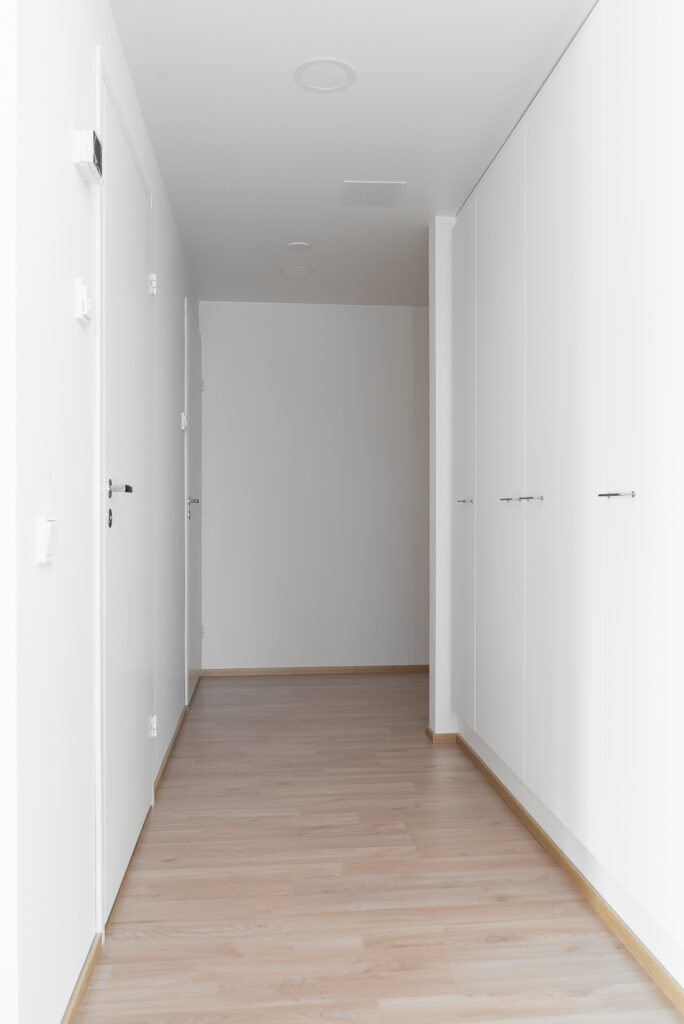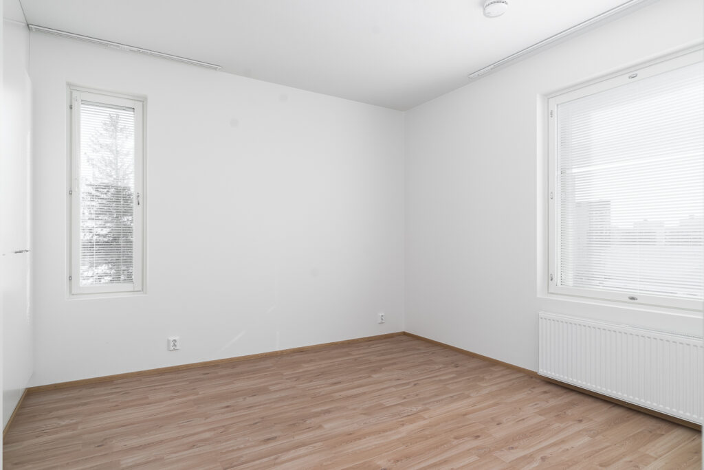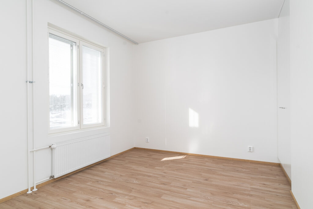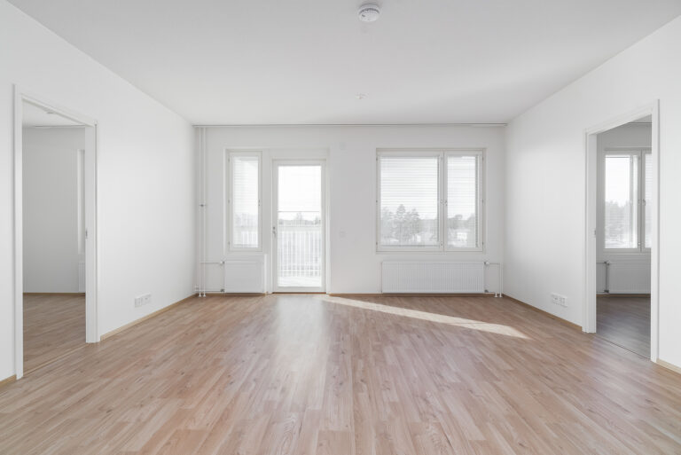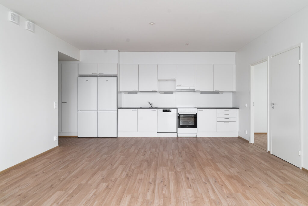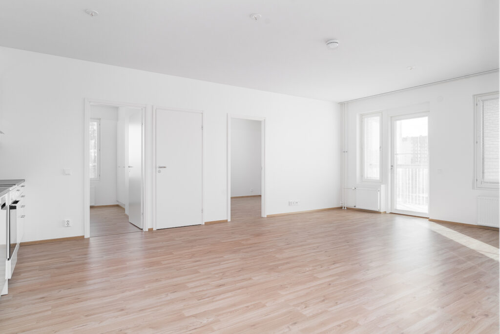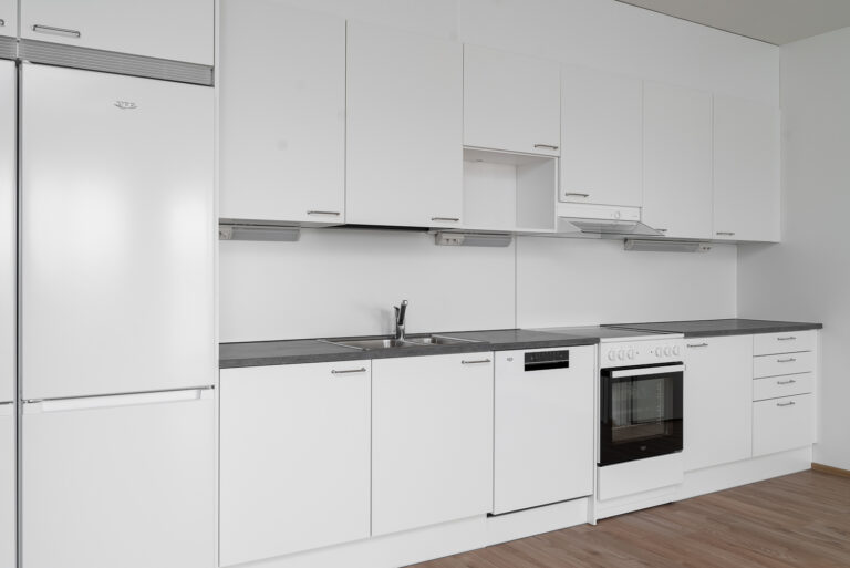 A spacious four-room rental apartment with a glazed balcony for extra space. In addition to the bathroom, the apartment has a separate toilet. Due to the neutral surface materials, the apartment is easy to decorate to your own style. The walls and floor of the bathroom and separate toilet are tiled. The bathroom has a laundry closet and space for a 60 cm wide washing machine and dryer. In the kitchens, the space between the lower and upper cabinets is laminated. The stoves are white, floor-standing stoves with a ceramic hob and oven. The four-room apartments have two fridge-freezer cabinets. All apartments have dishwashers. The apartment has cold and hot water consumption meters and a display board where you can monitor your own apartment’s water consumption.