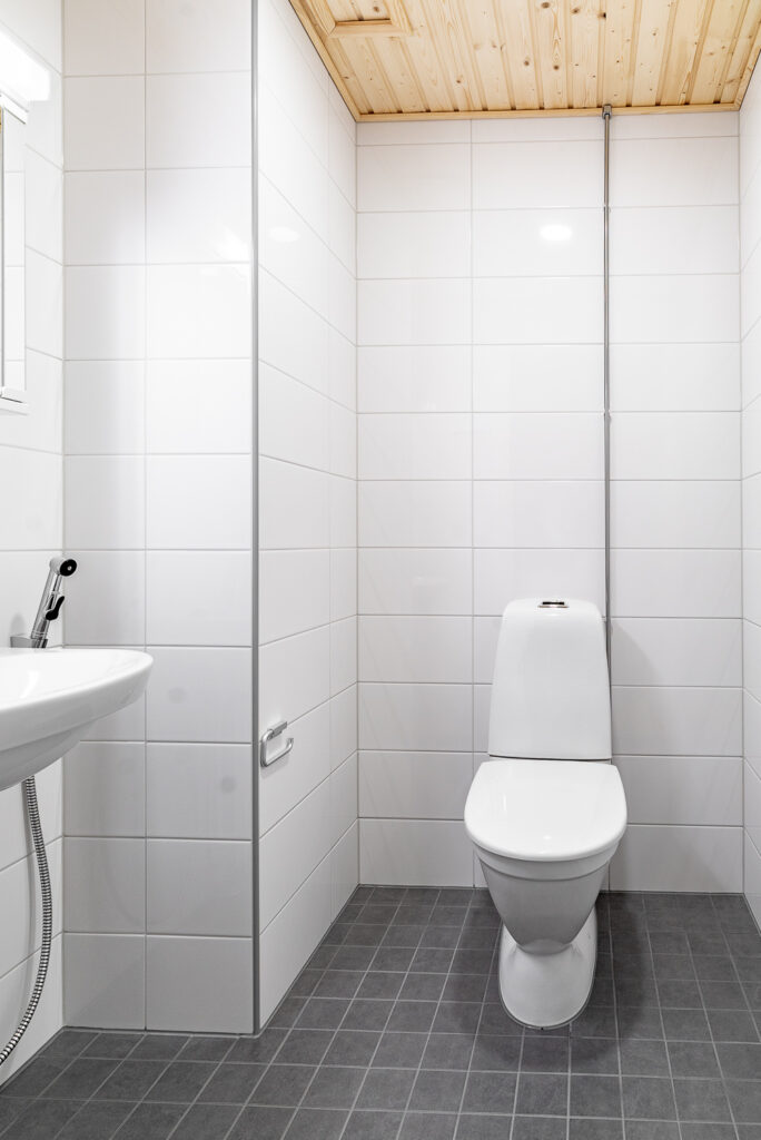 The first floor of the house has a laundry and drying rooms, storage rooms for strollers and outdoor equipment, as well as storage rooms for movable property and emergency shelters. There is an unheated bicycle storage building in the yard, which is partly shared with the neighboring property. There are also two sauna sections on the first floor.