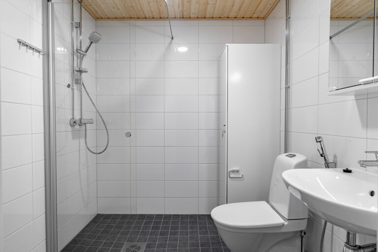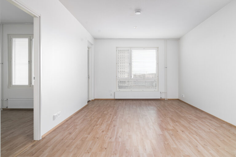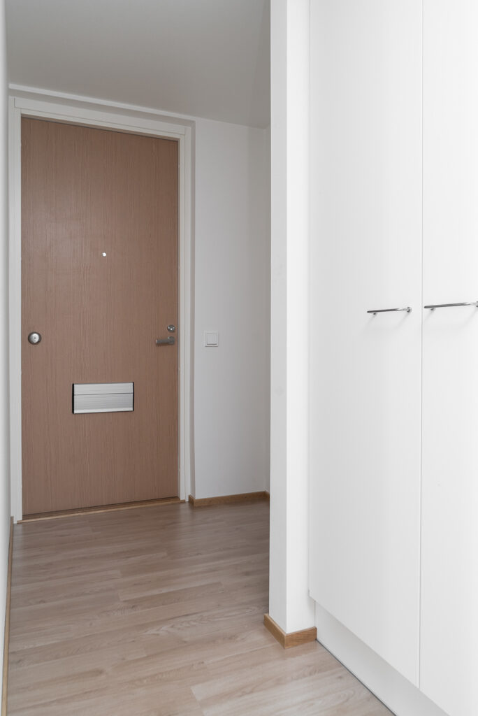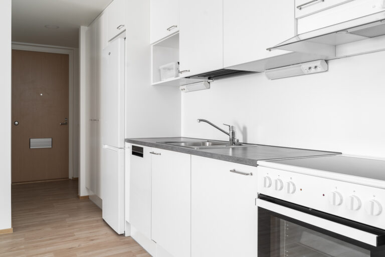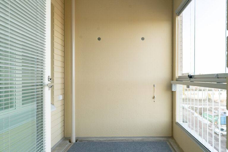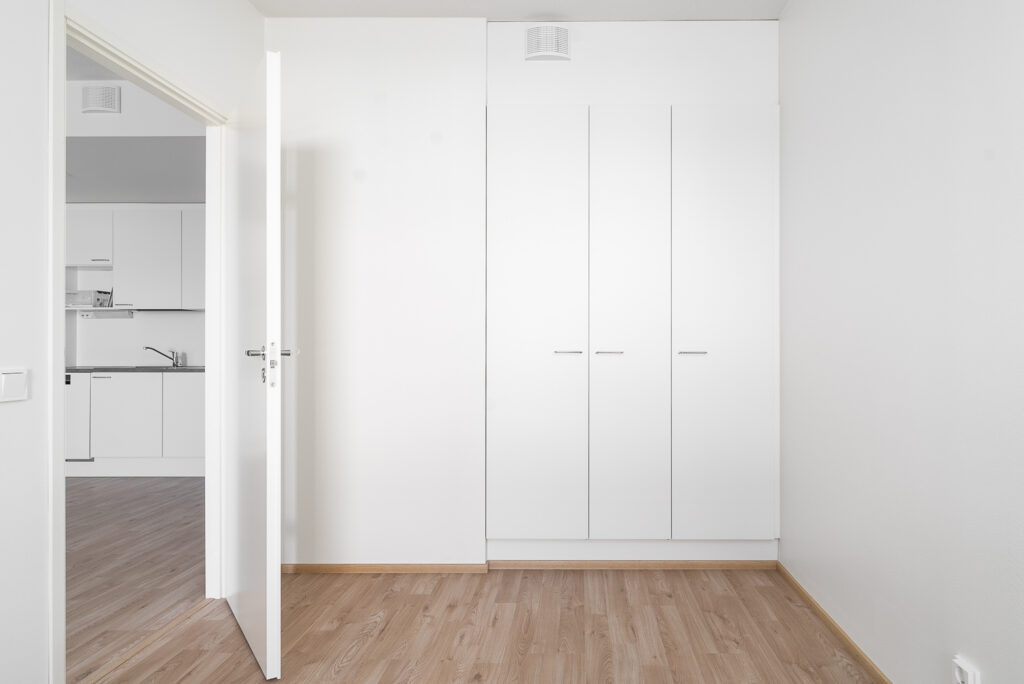 A two-room apartment designed as a functional and comfortable unit. The apartment is entered through a hallway, which is connected to a storage space. The apartment’s open kitchen opens into the living room. The kitchen has a fridge-freezer, a white 60 cm wide dishwasher, a 60 cm wide space for a microwave oven and a ceramic floor-standing stove. The bathroom has a laundry closet, space for a 60 cm wide washing machine and dryer, and washing machine connections and sockets are ready. The bedroom and the apartment’s comfortable glazed balcony are accessed through the living room.