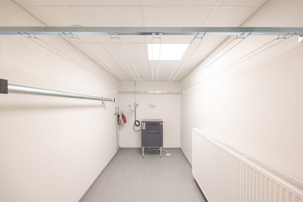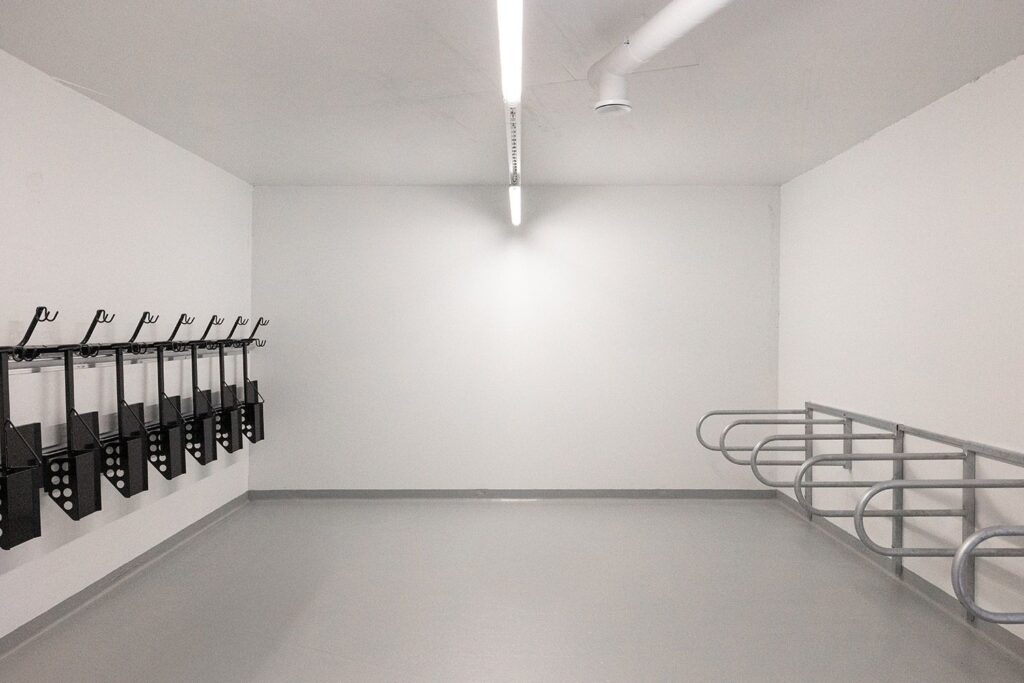 Residents have access to a laundry, drying room, club room and 45 parking spaces in the yard, 12 of which are equipped with electric car charging. The play and recreation area is shared with the neighboring houses. Parking spaces are primarily reserved for larger apartments.