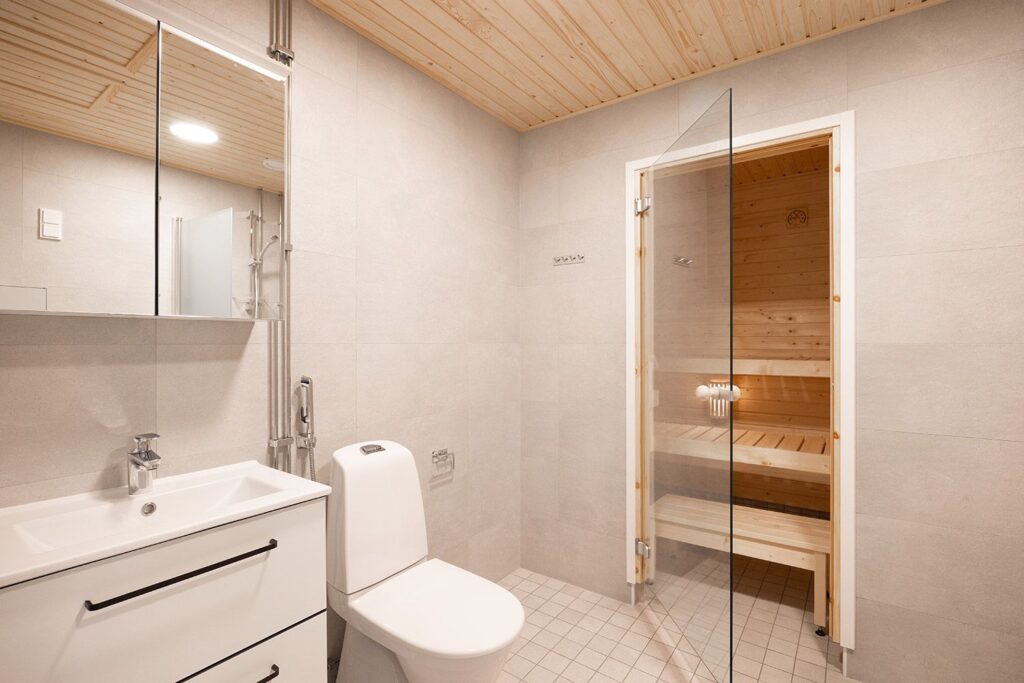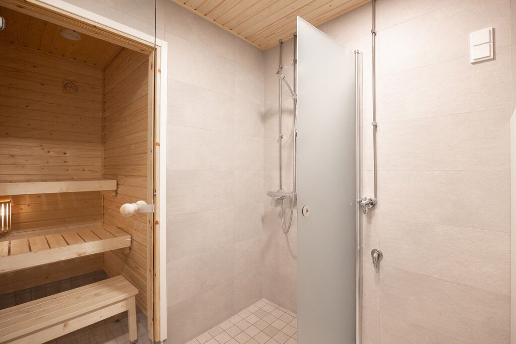 A spacious 4/5th floor two-room apartment with a sauna, whose kitchen, dining area and living room are an open, unified space. The dressing room connected to the bedroom provides storage space. The glazed balcony faces northeast, towards the courtyard.