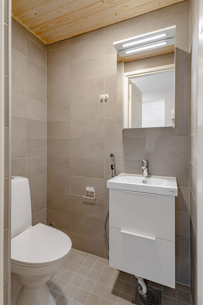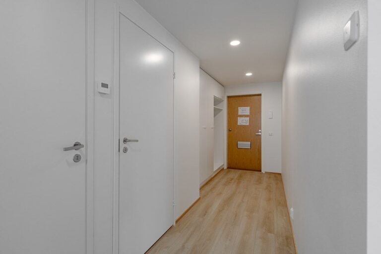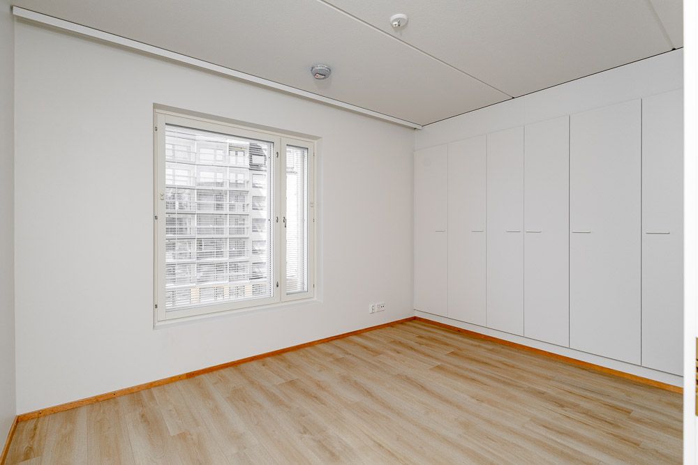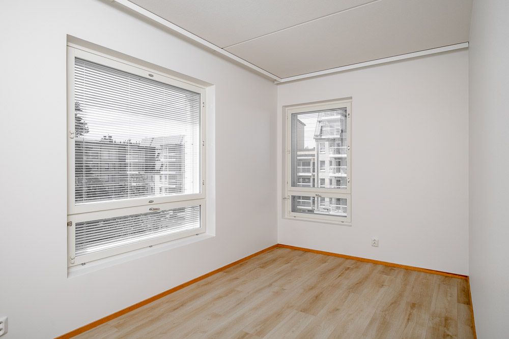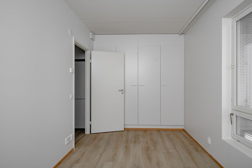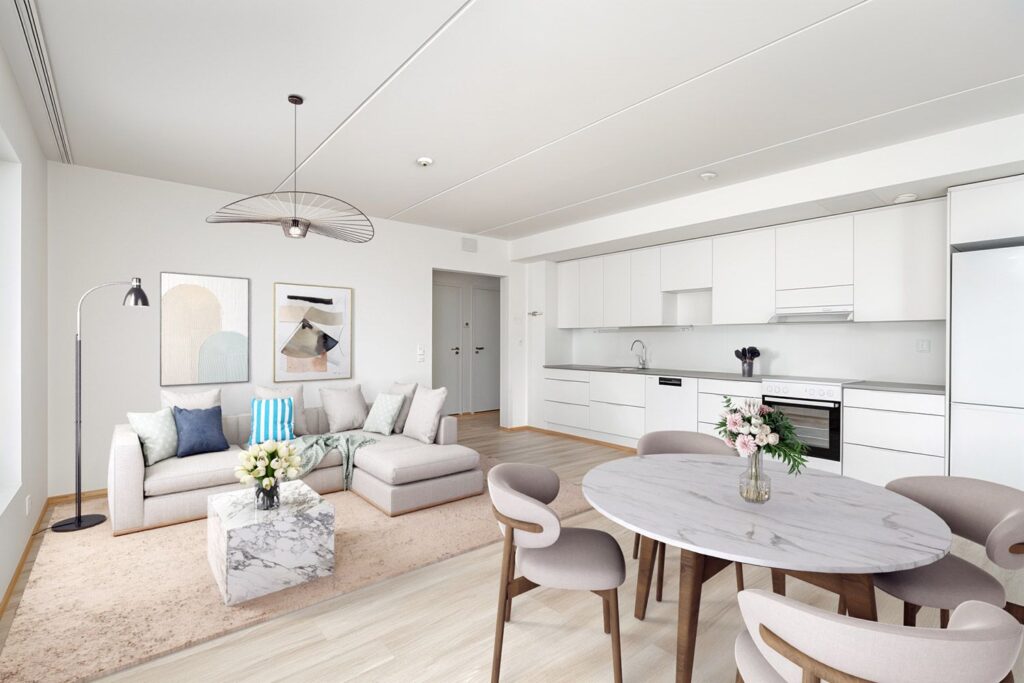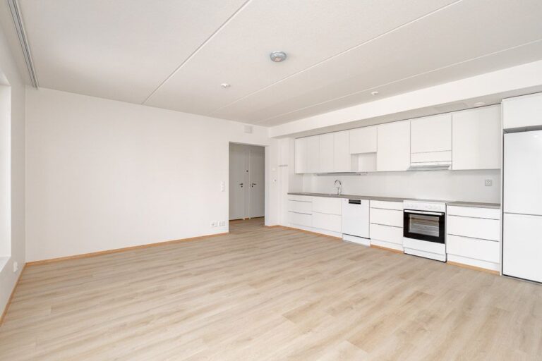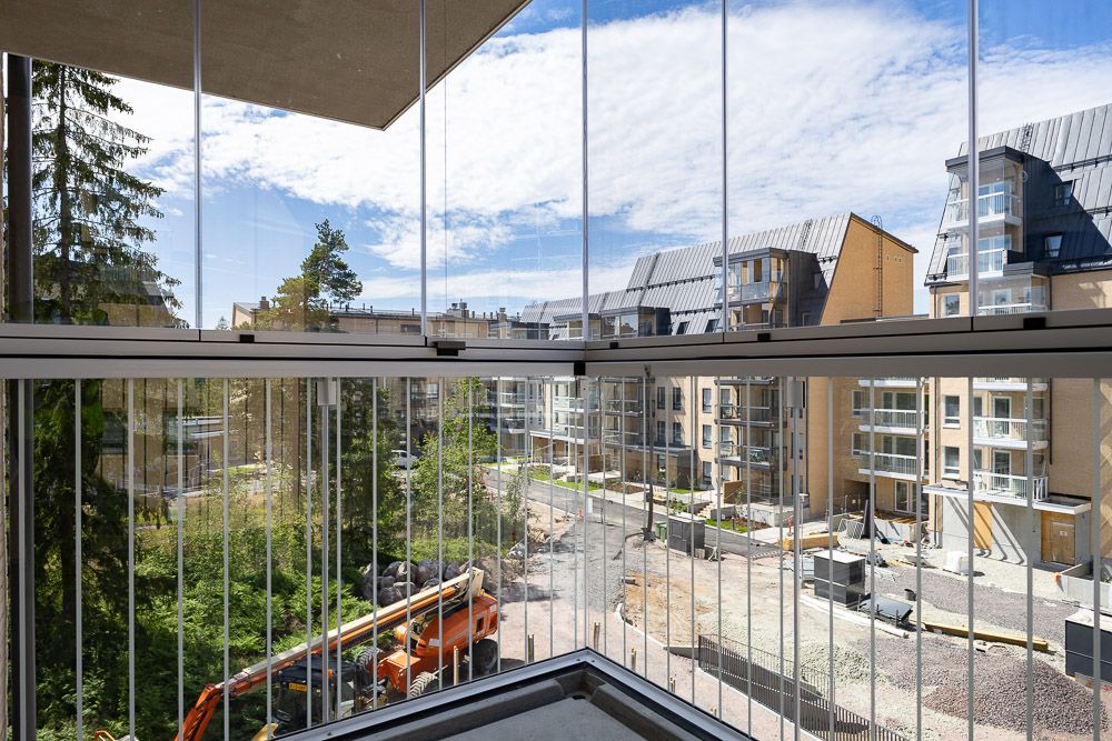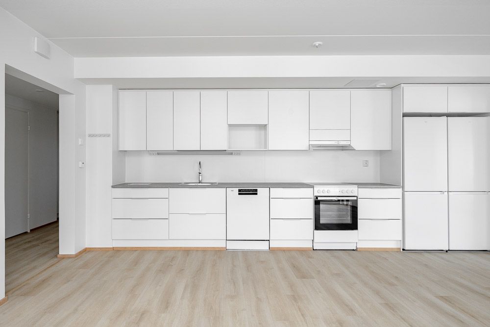 A corner apartment with light from two directions. The kitchen and living room are a single, open space, which also provides access to the apartment’s glazed balcony. The kitchen, which is located on one wall, has a dishwasher. The apartment has a separate toilet in addition to the bathroom. The bathroom has its own sauna and space for a washing machine and a washing tower. The floors in the living areas are laminate, and the bathroom and separate toilet are tiled.