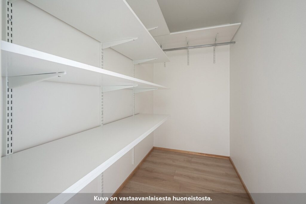 The apartments on the top floor are equipped with an apartment-specific ventilation unit and cooling. The apartment has a spacious and functional floor plan. The kitchen is a single space with the living room. The bedrooms are spacious, and one of them has a walk-in closet, the other has cabinets. The living room has access to a glazed balcony, which serves as an additional room from early spring to late autumn. The kitchen is equipped with a dishwasher, and the bathroom has space for a washing machine/washing tower.