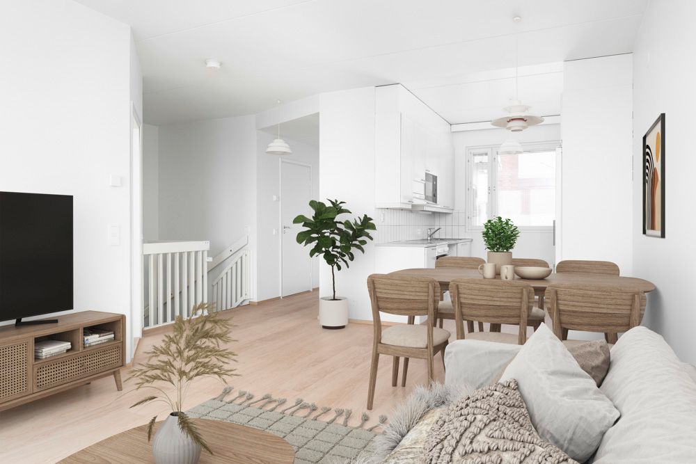 The apartments have district heating and a shared antenna system, and the fee includes an Elisa broadband connection. The apartments have individual storage rooms for personal belongings, and the project also has outdoor equipment storage rooms, a drying room and a children’s playground.