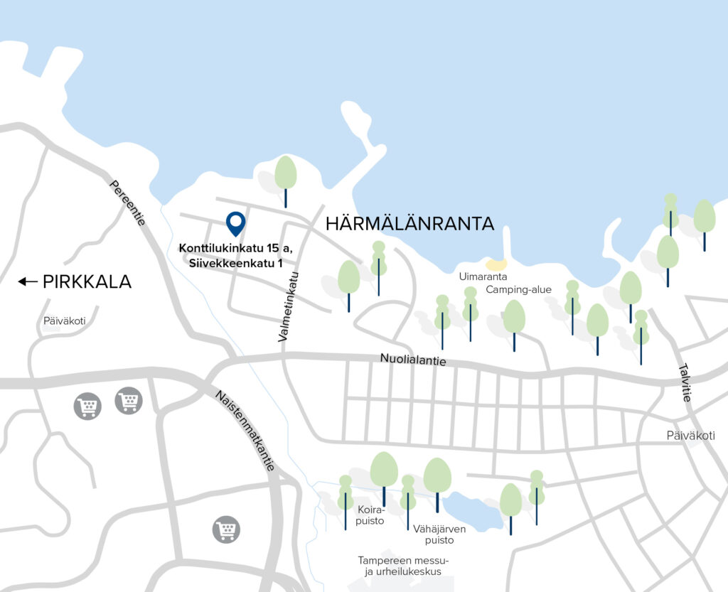 Härmälänrannan arkea tukee se, että päivittäiset palvelut ovat saavutettavissa ilman pitkää siirtymää. Osa palveluista on aivan lähellä, ja laajempi asiointi tukeutuu erityisesti Härmälän, Hatanpään ja Partolan suuntaan. Alueella asuminen sopii hyvin tilanteeseen, jossa haluaa yhdistää järvenrannan rauhan ja käytännöllisen arjen.