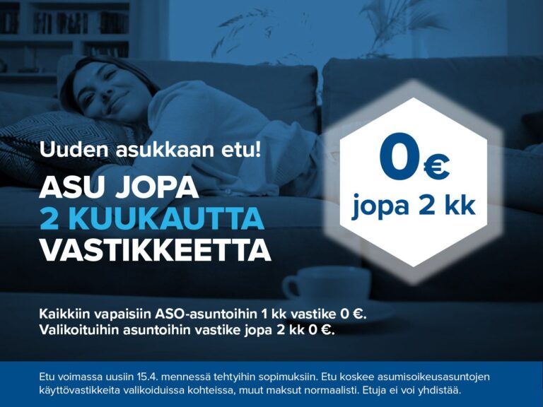 Hintatakuumme piirissä on myös valoisia ja hyväpohjaisia ASO-asuntoja Viertolassa, Koivuhaassa ja Länsimäessä ja Jokiniemessä. Tutustu ja löydä sinun seuraava kotisi! Suosittelemme täyttämään heti hakemuksen, jotta olet mukana asunnon hakijoiden joukossa, kun asuntoja tarjotaan. Pääset katsomaan sinulle tarjottua asuntoa ennen päätöstäsi.