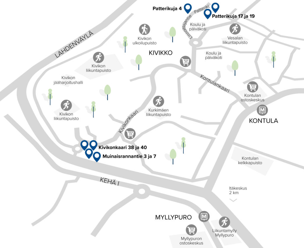 - Kivikkoon pääsee kätevästi metrolla. Myllypuron ja Kontulan metroasemat ovat lyhyen, alle kahden kilometrin, kävelymatkan päässä ja bussiyhteydetkin metroasemalle toimivat hyvin