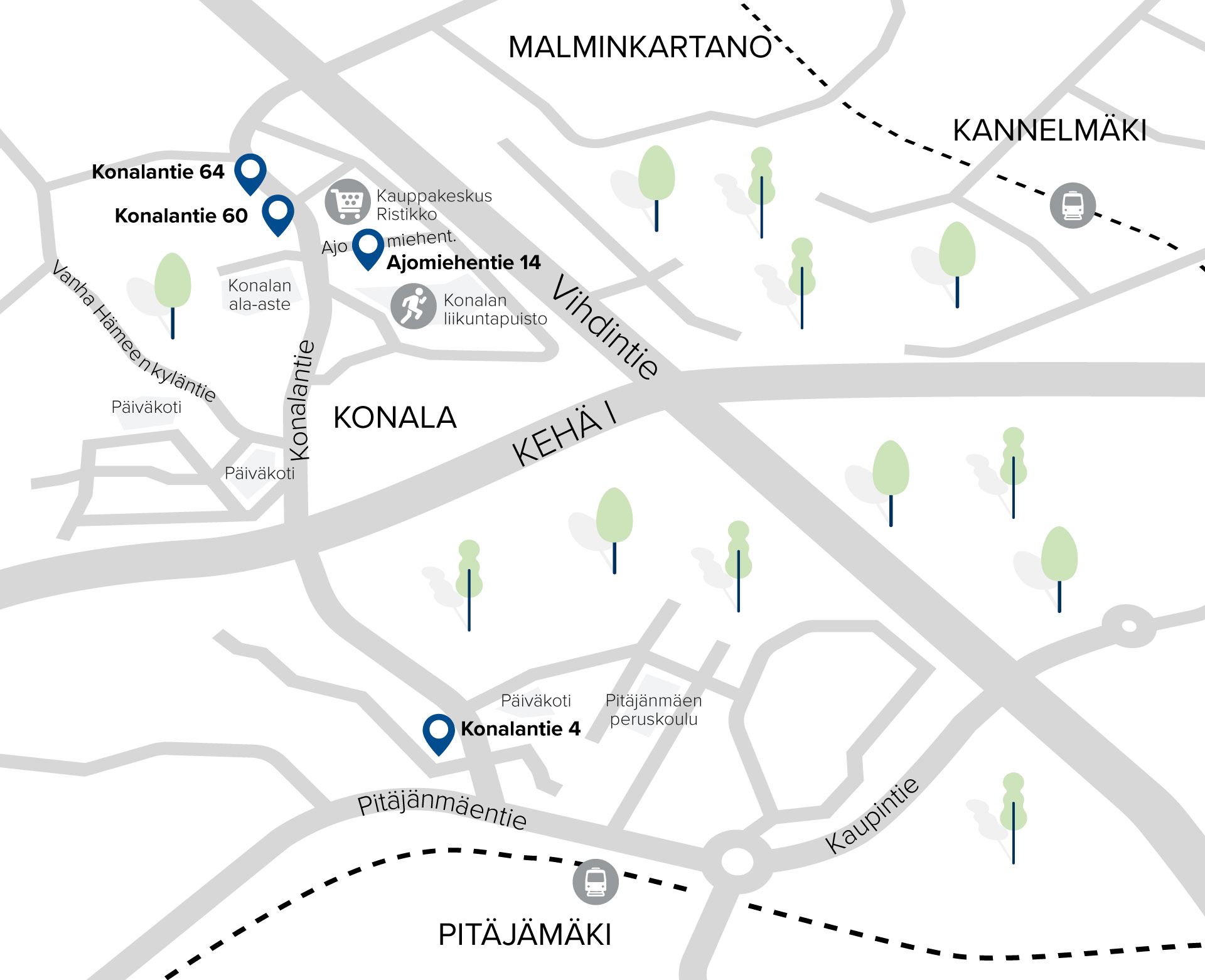 Konala tarjoaa asukkailleen monipuoliset palvelut, hyvät liikenneyhteydet ja viihtyisän ympäristön. Olipa kyseessä päivittäinen asiointi, terveyspalvelut tai vapaa-ajan aktiviteetit, Konalasta löytyy ratkaisut moneen tarpeeseen.
