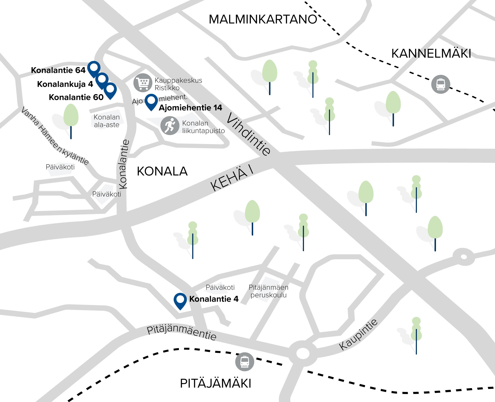 Konala tarjoaa asukkailleen monipuoliset palvelut, hyvät liikenneyhteydet ja viihtyisän ympäristön. Olipa kyseessä päivittäinen asiointi, terveyspalvelut tai vapaa-ajan aktiviteetit, Konalasta löytyy ratkaisut moneen tarpeeseen.