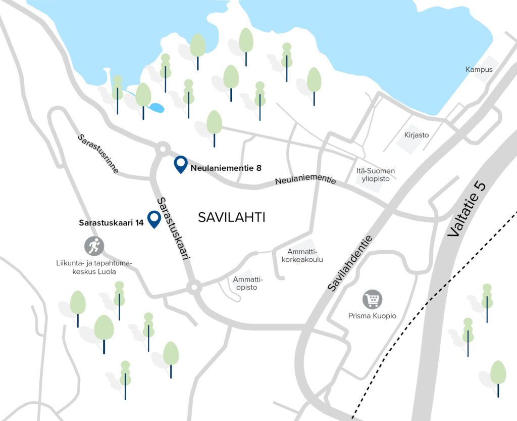 Savilahti sijaitsee ihanteellisella paikalla Kuopion keskustan länsipuolella. Luonnonläheinen ja kehittyvä asuinalue sopii moneen elämäntyyliin ja -tilanteeseen.