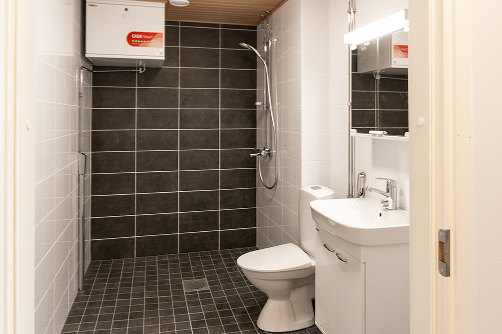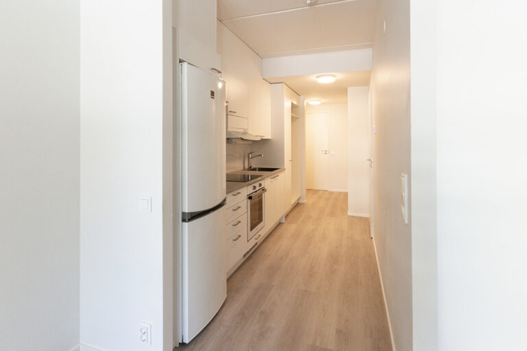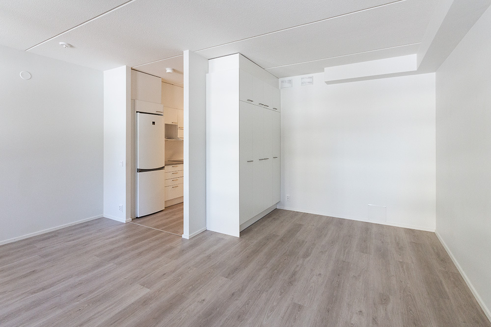 Denna väldesignade studiolägenhet är utformad för att vara praktisk och rymlig. Köket och vardagsrummet bildar ett enhetligt, lättinrett utrymme, och sovalkoven erbjuder en egen separat och fridfull sovplats. Badrummet har plats för tvättmaskin, och det finns gott om förvaringsutrymme i hallen. Dessutom ger en mysig balkong som löper längs hela lägenhetens bredd ytterligare utrymme.