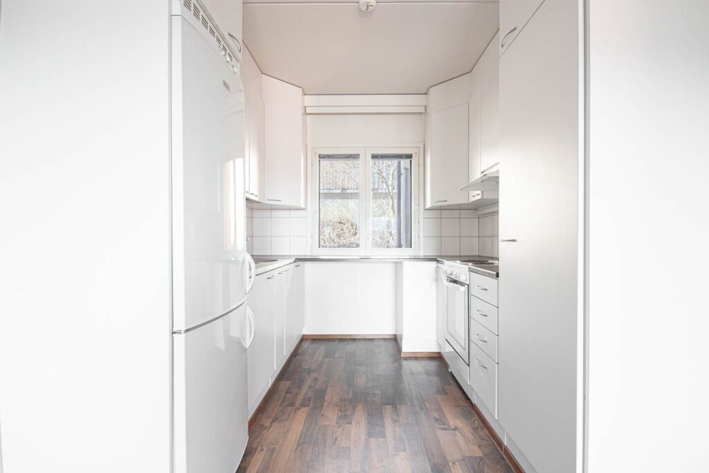 Denna loftlägenhet på nedre våningen erbjuder boendekomfort och rymlighet. Lägenheten har egen trädgård, bastu och funktionell kök-vardagsrumskombination. Skafferiet är trevligt stort och köksfönstret ger ljus till bänkskivorna som är placerade på tre väggar.