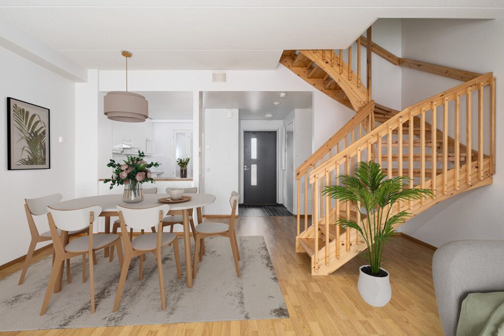 Rymlig familjelägenhet i ett lugnt radhuskomplex. Läget är idealiskt för en barnfamilj, då bakgården har en bekväm utsikt över bostadskomplexets lekplats. Det största sovrummet på övervåningen har en fransk balkong med ventilation.
