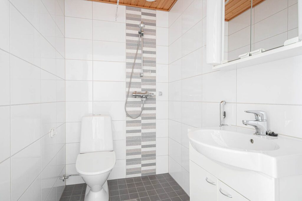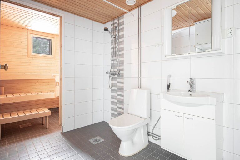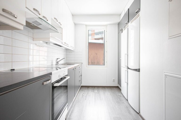 Vattencirkulerande golvvärme ökar boendekomforten och gör inredningen enklare, eftersom det inte finns några värmeelement på väggarna. Snygga och moderna ytmaterial gör lägenheten särskilt mysig.