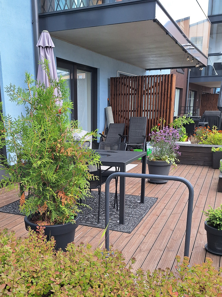 En duplexlägenhet på bottenvåningen i ett modernt hyreshus i Kuninkaantamme. Lägenheten har en egen härlig terrass som vetter mot en lugn innergård i sydost. Kök och vardagsrum är ett stort utrymme. Sovrummet leder ut till lägenhetens terrass. En privat bastu och en rymlig klädkammare bidrar till boendekomforten. Lägenheten har laminatgolv och badrummet är kaklat. Bilderna visar en lägenhet i liknande storlek på en annan våning. Ytmaterialen kan variera.