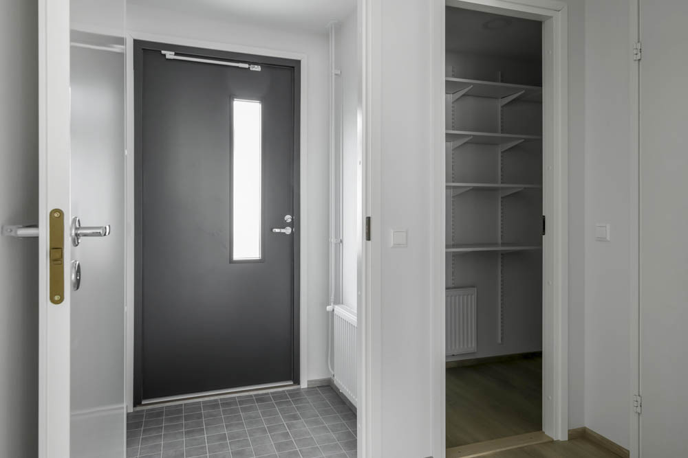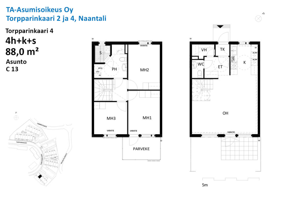 Bottenvåningen i lägenheten har ett kök och en rymlig matplats i anslutning till vardagsrummet, samt en separat garderob. Vardagsrummet har utgång till en egen bakgård. Sovrummen ligger på övervåningen i sin egen lugn och ro. Ett rymligt och elegant kaklat badrum, som rymmer en tvättmaskin. Du kan njuta av värmen i din egen bastu när det passar dig! Två separata toaletter ökar boendekomforten. Lägenhetsanpassade förråd finns i tvättstugan bredvid lägenheten.