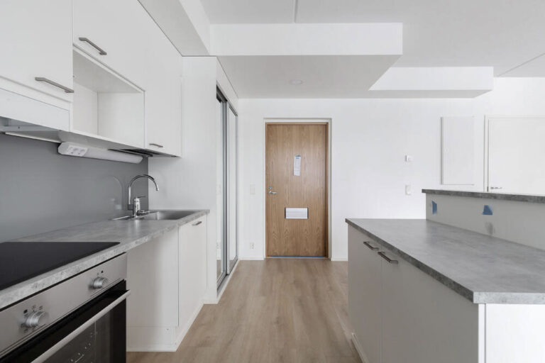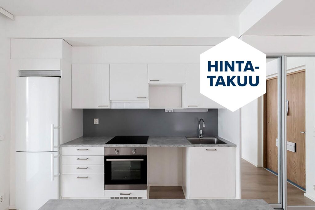 Lägenhetens hjärta är det rymliga och enhetliga vardagsrummet-köket-matplatsen. Detta utrymme är utformat för modernt boende, och de stora fönstren ger gott om naturligt ljus in i utrymmet. Det finns också utgång till balkongen, som är den perfekta platsen att koppla av på. Golvet är ljust laminat, vilket gör lägenheten ljus och rymlig. De vita skåpen och de grå bänkskivorna i köket skapar ett modernt och tydligt utseende. Lägenheten har två separata sovrum, som båda har garderobsutrymme. Det finns också gott om garderobsutrymme i hallen för ytterkläder och skor. Badrummet är stilfullt kaklat, och det finns en privat bastu i anslutning till det.