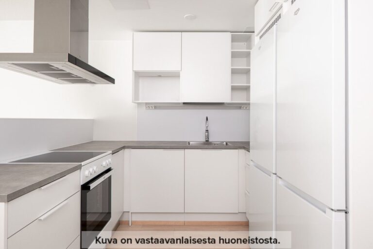 Lägenhetens U-formade kök är utformat så att allt du behöver finns inom räckhåll. Bänkskivorna är gjorda av slitstarkt laminat och diskhon i rostfritt stål bidrar med elegans. Köket har en kyl-frys i fullhöjd och utrymme för diskmaskin och mikrovågsugn, vilket gör vardagen enklare.