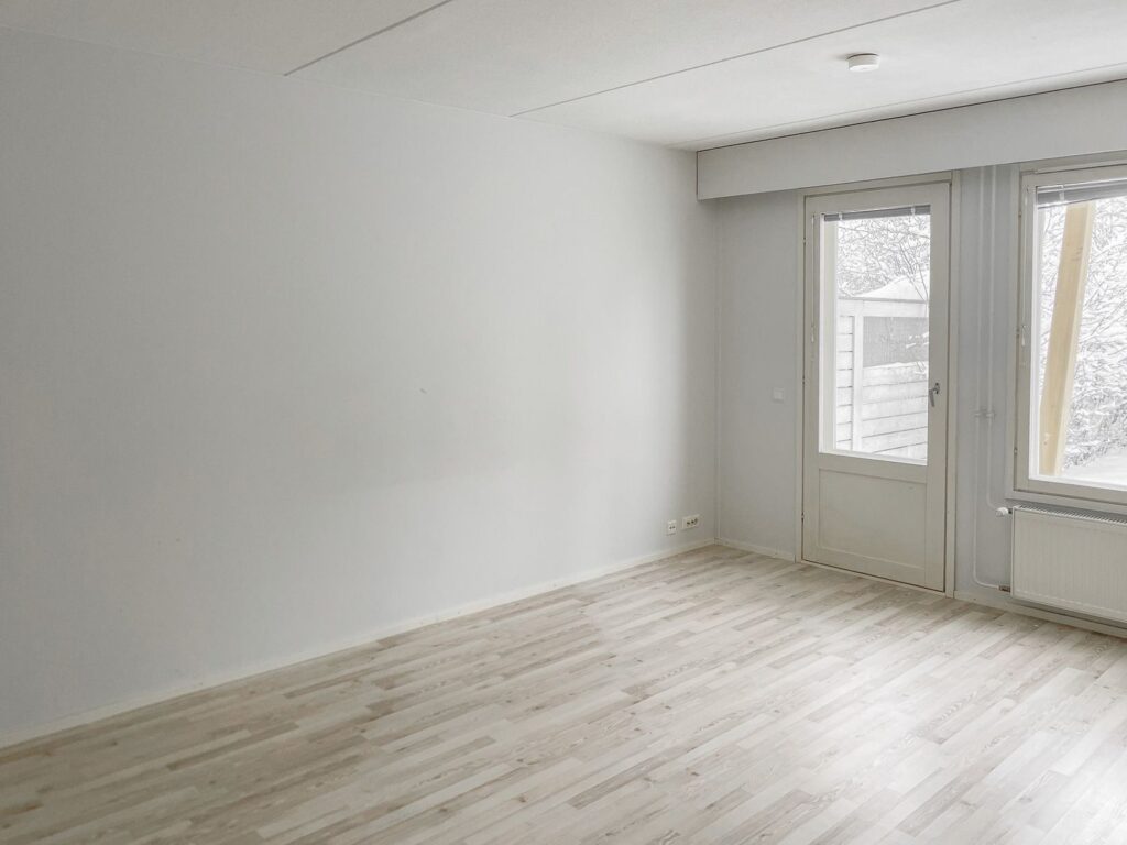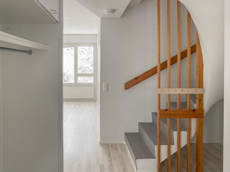 Ett parhus för en stor familj. En charmig tvåvåningsbostad för fem personer, med en stomme för ett fridfullt boende. Golven är ljusa och fönstren har persienner. Lägenhetens två badrum, bastu och privat terrass och balkong bidrar till boendekomforten.