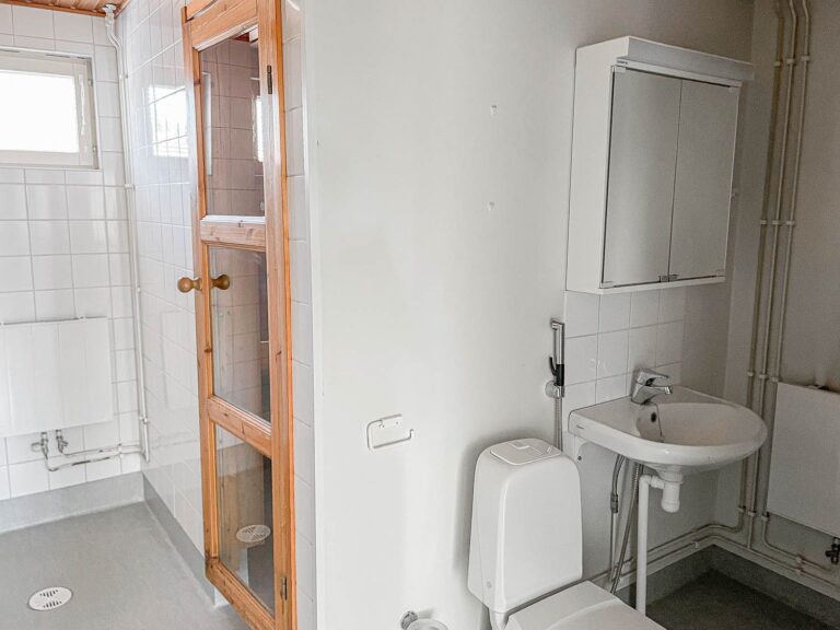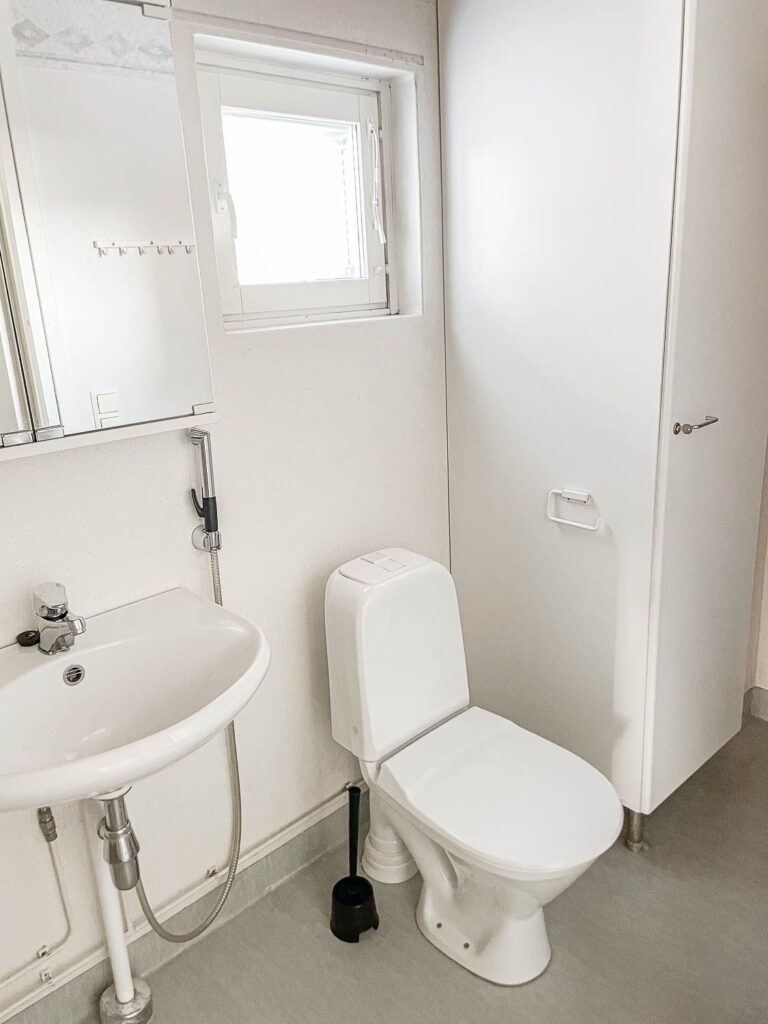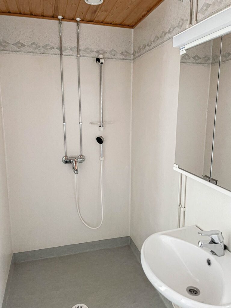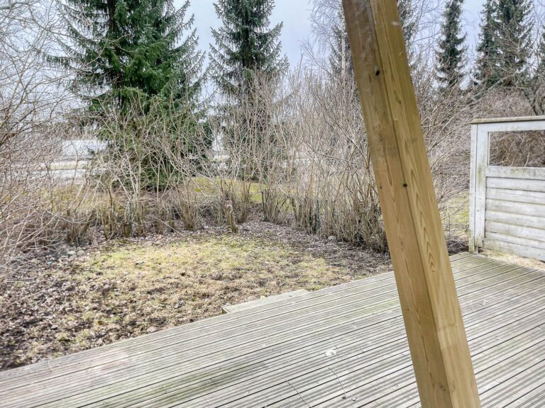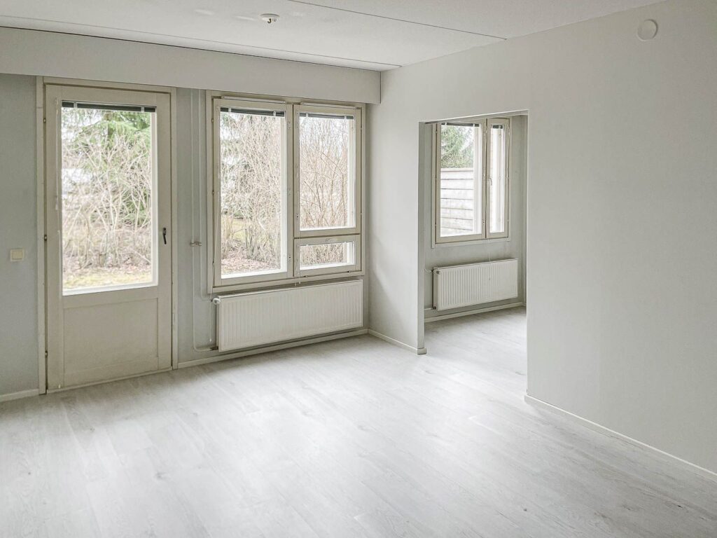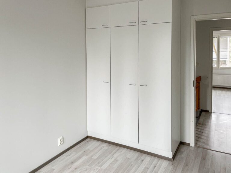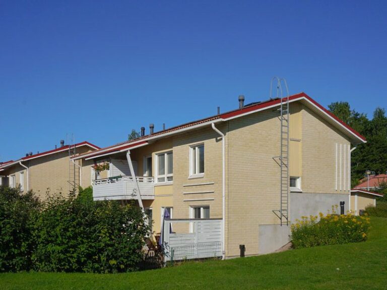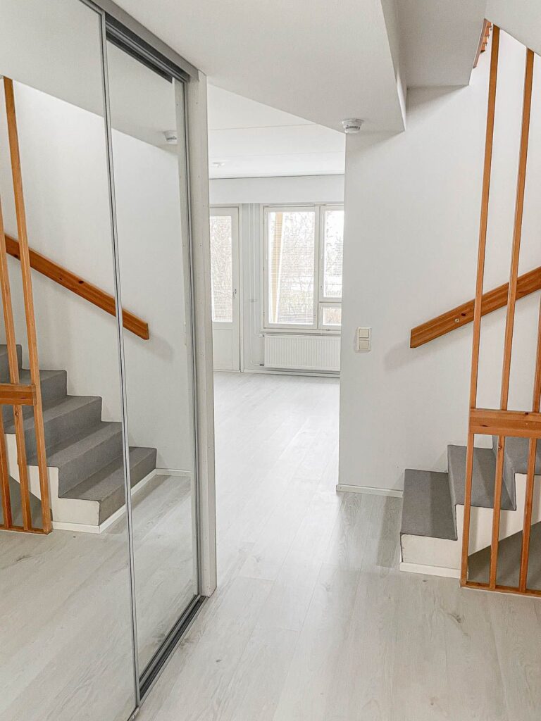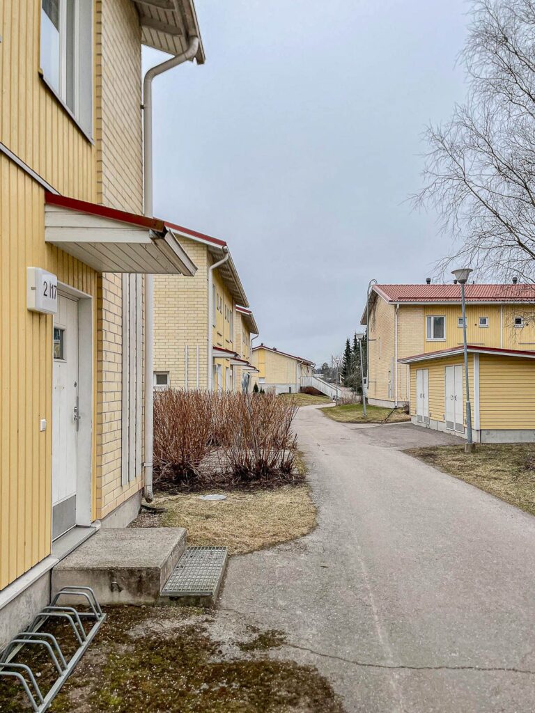 Förutom vardagsrum och kök har entréplanet ett sovrum, separat toalett/dusch och en trädgård. På övervåningen finns två sovrum, en klädkammare och en balkong. Golven i bostadshusen är ljusa laminatgolv. Lägenheten har därför gott om förvaringsutrymme. Lägenheten inkluderar också ett separat utomhusförråd för varje lägenhet. Fönstren har persienner.
