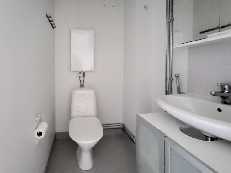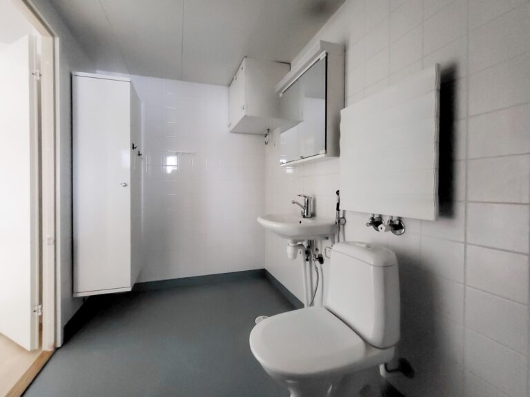 Det rymliga köket/vardagsrummet har utgång till en balkong. Det finns en rymlig klädkammare i anslutning till det stora sovrummet. Två toaletter och en bastu med vädringsfönster bidrar till boendekomforten. Lägenheten inkluderar ett uppvärmt förråd. De boende har fri tillgång till tvättstugan.