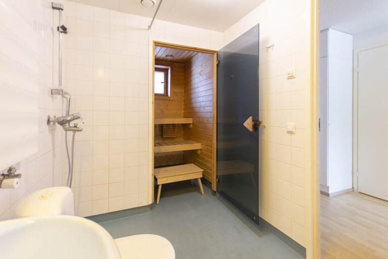 Köket/vardagsrummet har tillgång till en privat inhägnad trädgård. Det finns en stor klädkammare i det stora sovrummet. Lägenheten har två toaletter och bastun har ett eget ventilationsfönster. Lägenheten inkluderar ett separat, uppvärmt förråd. De boende har fri tillgång till tvättstugan.